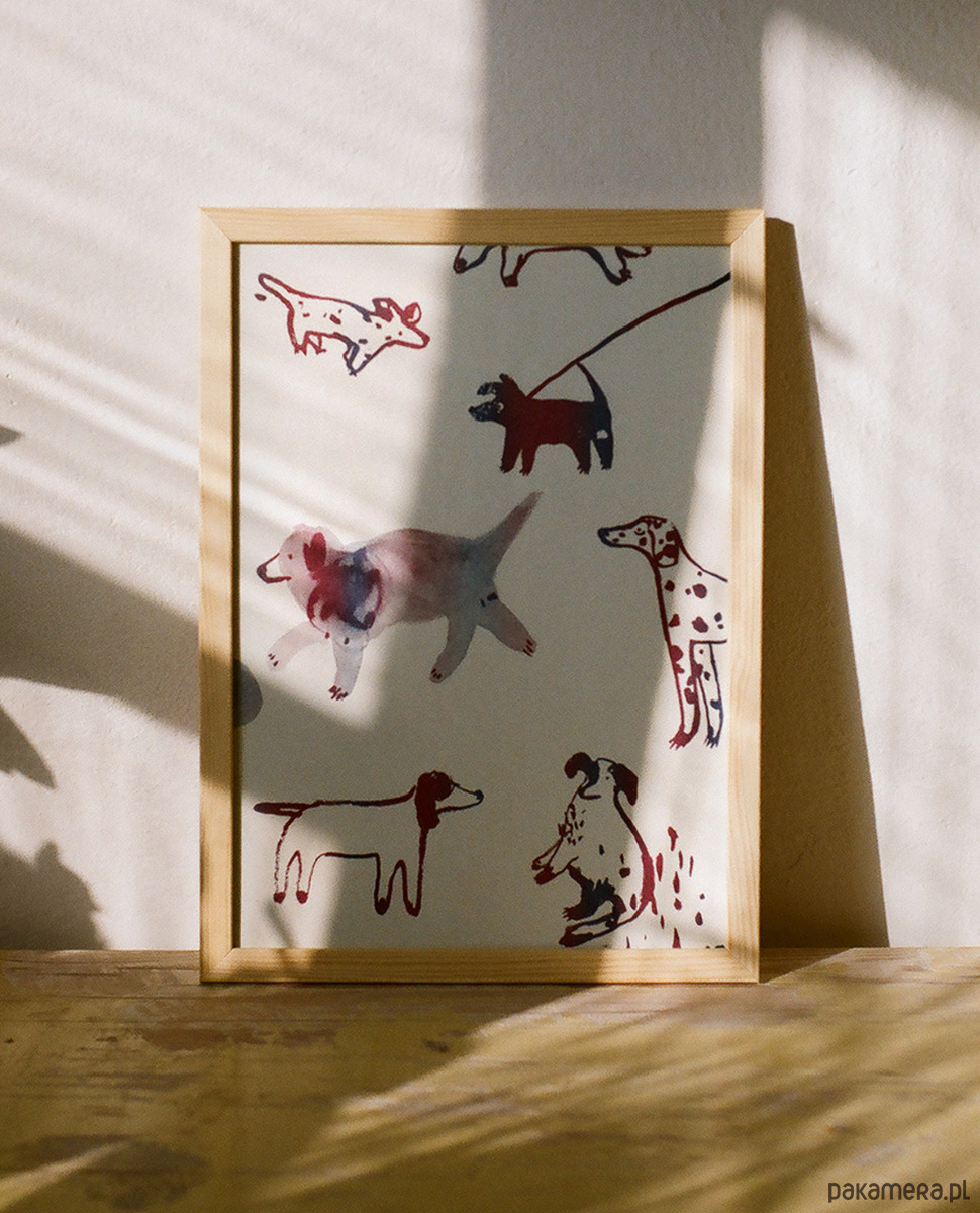 Grafika Walking the dog w pięknym fioletowo-niebieskim odcieniu, drukowana w technice riso.