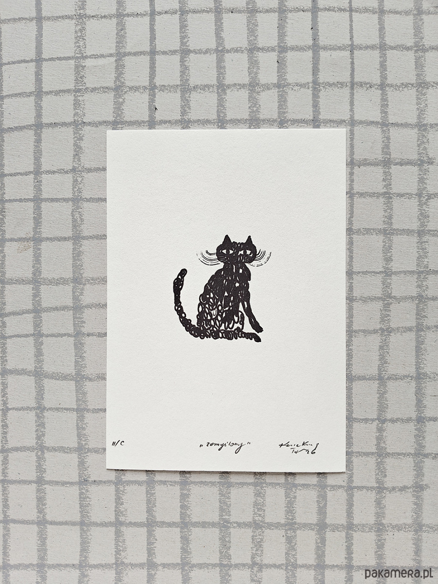 Mała grafika z czarnym kotem- a5, podpisana, numerowana
