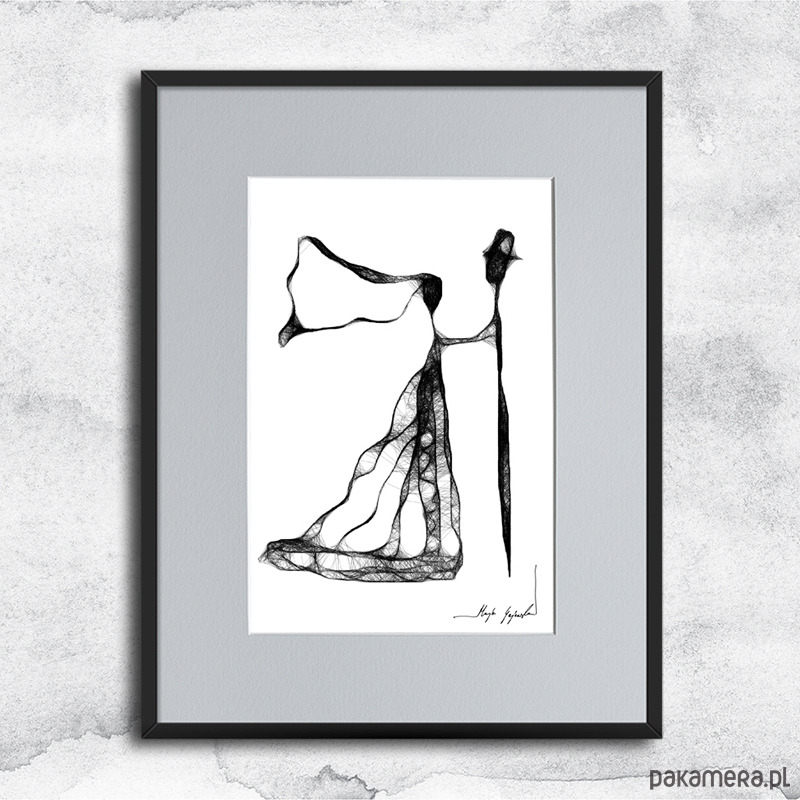 Autorska grafika wykonana techniką mieszaną (giclée+rysunek isografem) na białym, matowym o lekko fakturowanej powierzchni, graficznym papierze Canson 250g. Unikalna kreska wygląda bardzo efektownie, zaś czarno-białe wykończenia wnętrz idealnie wpisują się puste w ściany nowoczesnych, minimalistycznych czy loftowych powierzchni.