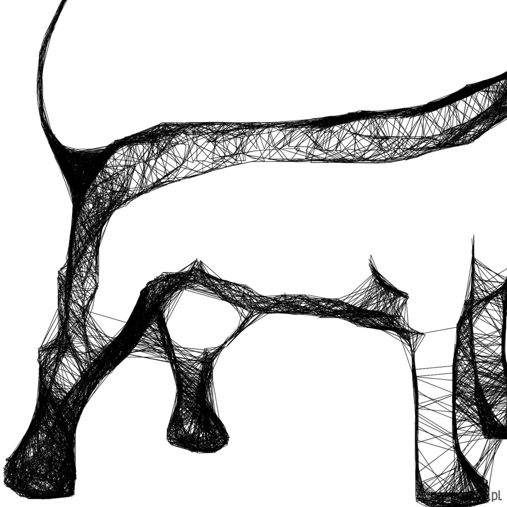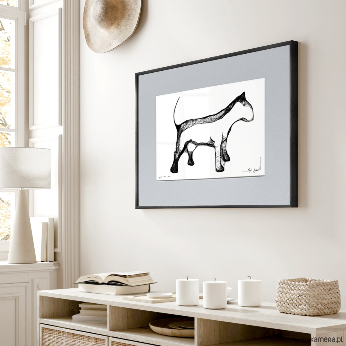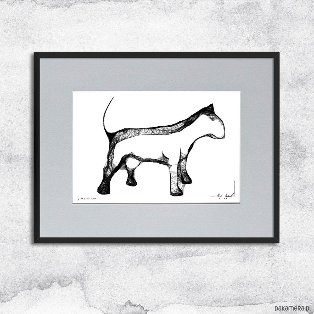 Autorska grafika wykonana techniką mieszaną (giclée, akwarela + rysunek isografem) na białym, matowym o lekko fakturowanej powierzchni, graficznym papierze Canson 250g. Unikalna kreska wygląda bardzo efektownie, zaś czarno-białe wykończenia wnętrz idealnie wpisują się puste w ściany nowoczesnych, minimalistycznych czy loftowych powierzchni. Minimalistyczne grafiki skupiają się na czystości formy ograniczając do podstawowych elementów, które doskonale przedstawiają charakterystykę konkretnych zwierząt. To pozwala oddać istotę zwierzęcia w sposób niezwykle skondensowany i wyrazisty.