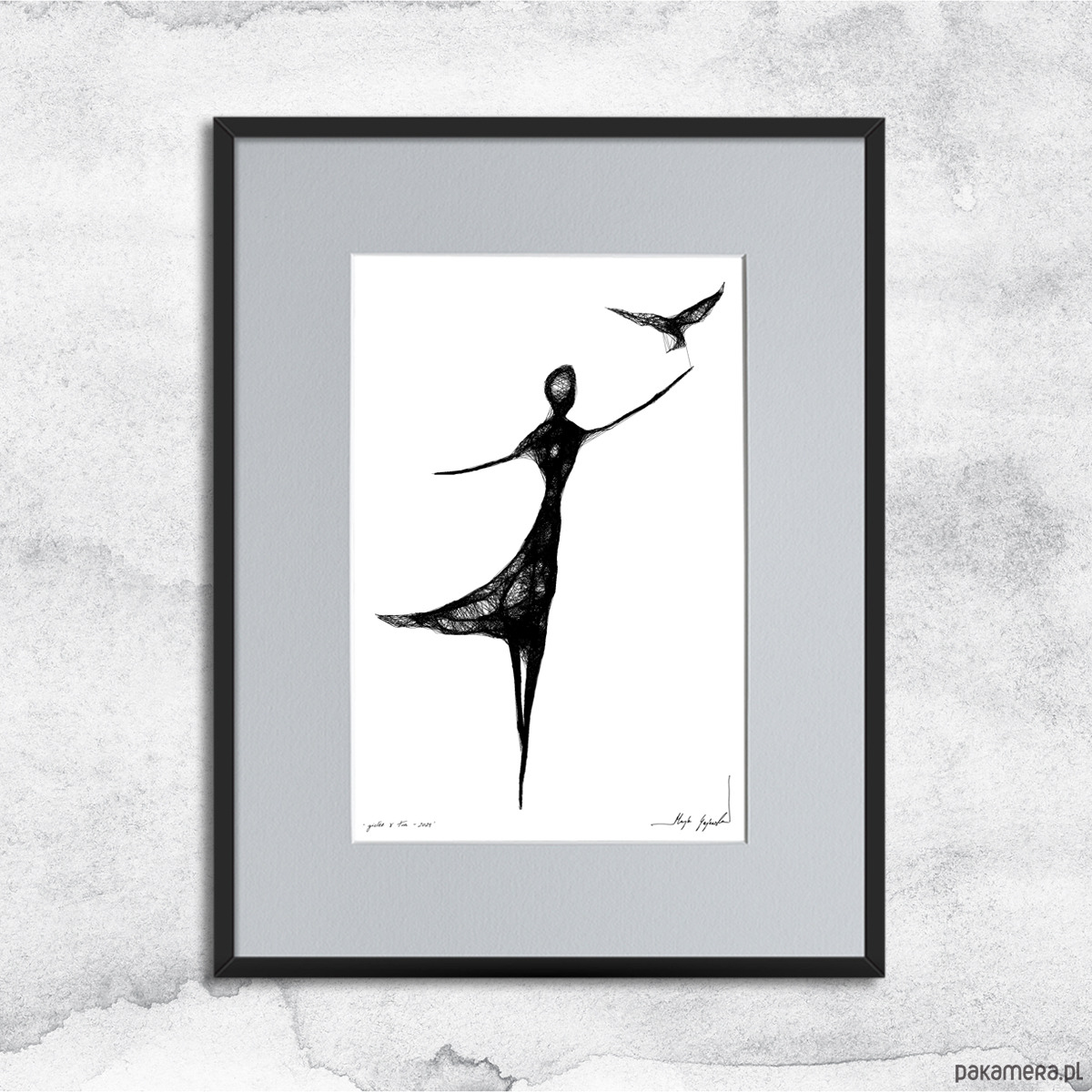 Grafika artystyczna została wykonana techniką mieszaną (giclée + rysunek isografem) na białym, matowym, o lekko fakturowanej powierzchni graficznym papierze Canson 250g. Proste, lecz wyrafinowane w formie i kresce, autorskie grafiki kobiet są idealną dekoracją na ścianę do salonu, sypialni, czy też gabinetu. Praca oprawiona w czarną, aluminiową ramę oraz grafitowe passe-partout.