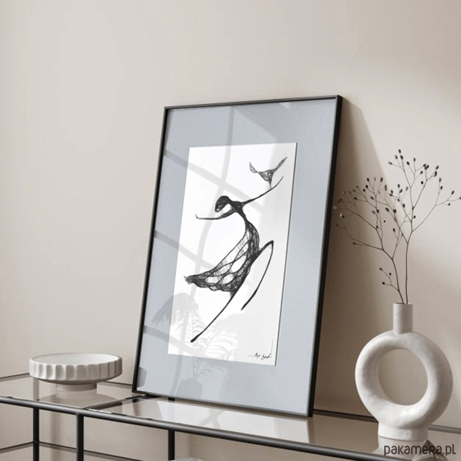 Grafika artystyczna została wykonana techniką mieszaną (giclée + rysunek isografem) na białym, matowym, o lekko fakturowanej powierzchni graficznym papierze Canson 250g. Proste, lecz wyrafinowane w formie i kresce, autorskie grafiki kobiet są idealną dekoracją na ścianę do salonu, sypialni, czy też gabinetu. Praca oprawiona w czarną, aluminiową ramę oraz grafitowe passe-partout.
