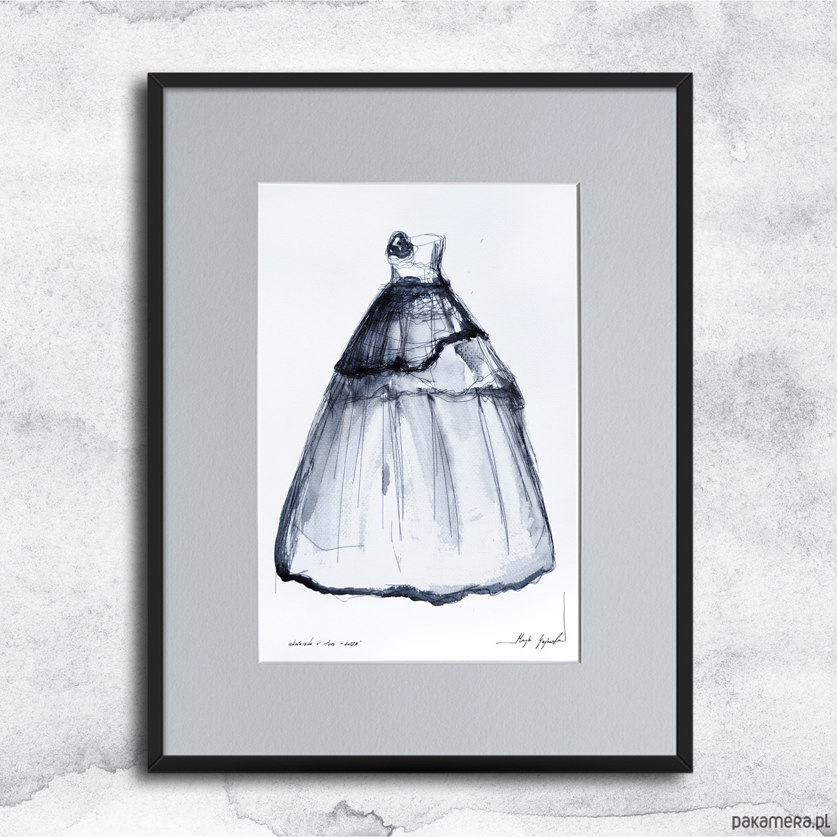 Praca jest oprawiona - czarna, aluminiowa rama oraz grafitowe passe partout. Front ramy stanowi szyba ze szkła akrylowego, bez ryzyka stłuczeń. Praca gotowa do powieszenia na ścianie.