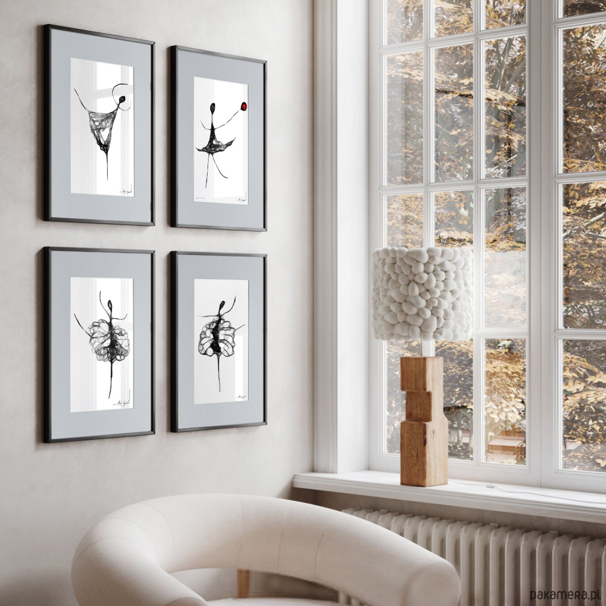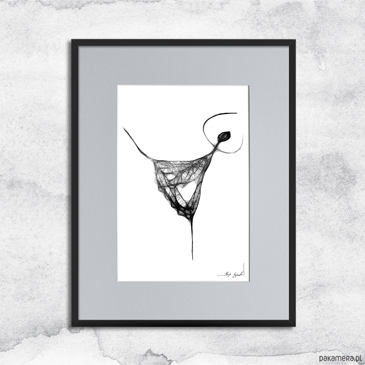 Autorska grafika wykonana techniką mieszaną (giclée rysunek isografem) na białym, matowym o lekko fakturowanej powierzchni, graficznym papierze Canson 250g. Unikalna kreska wygląda bardzo efektownie, zaś czarno-białe wykończenia wnętrz idealnie wpisują się puste w ściany nowoczesnych, minimalistycznych czy loftowych powierzchni.