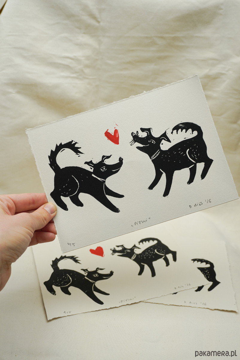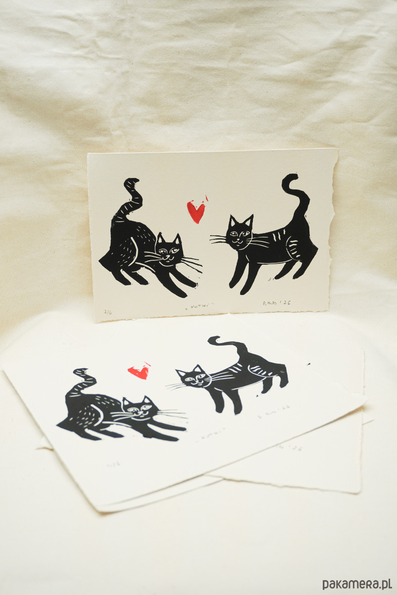 Linoryt "Zakochane Zwierzątka". Ręcznie drukowany linoryt na czerpanym papierze graficznym, świetny na prezent na Walentynki i nie tylko.