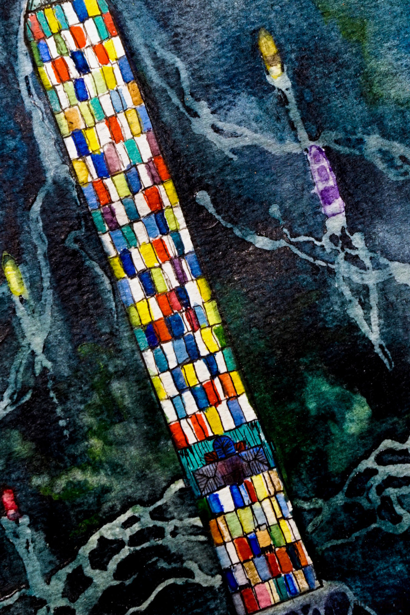 Akwarela przedstawia płynący kontenerowiec w perspektywy lotu ptaka.