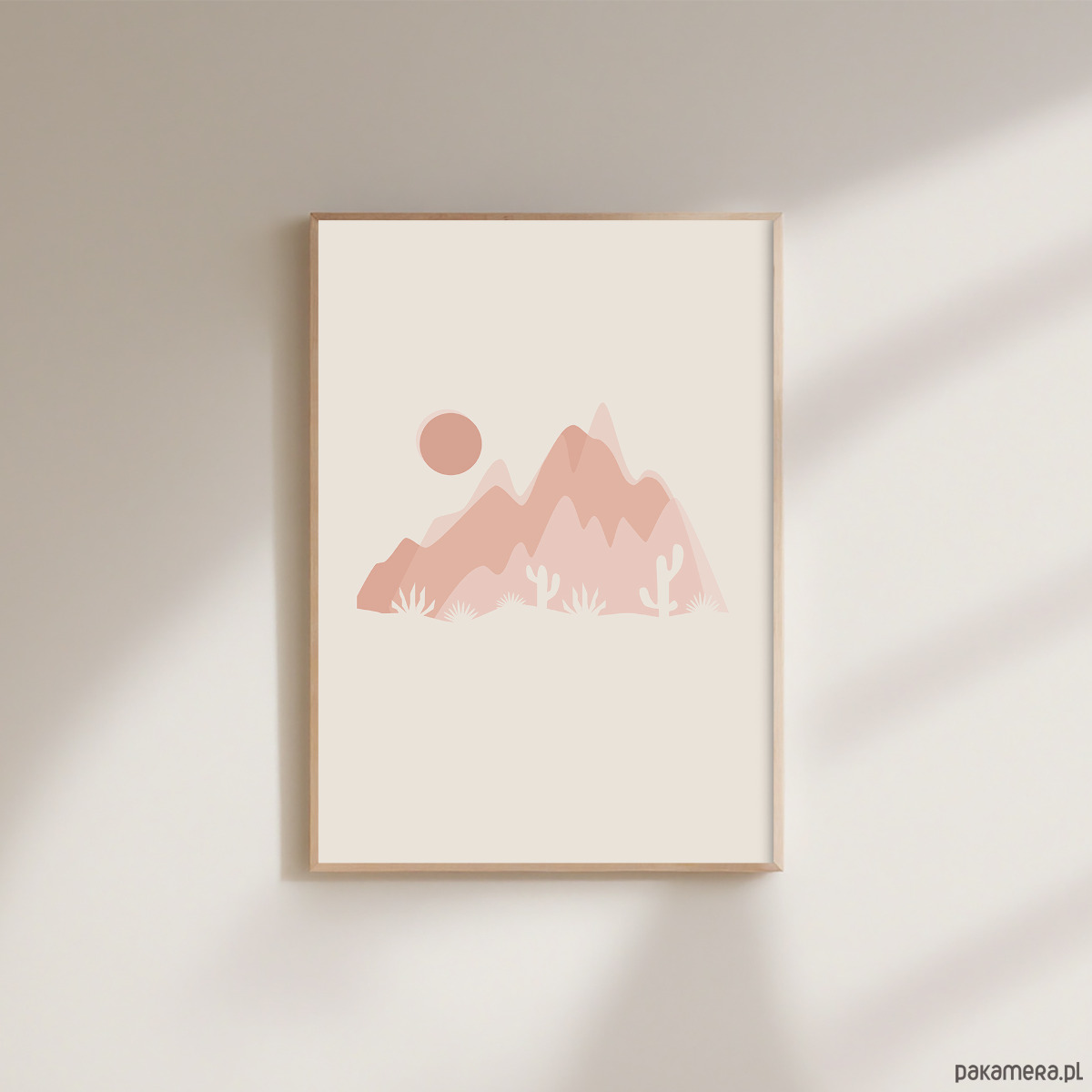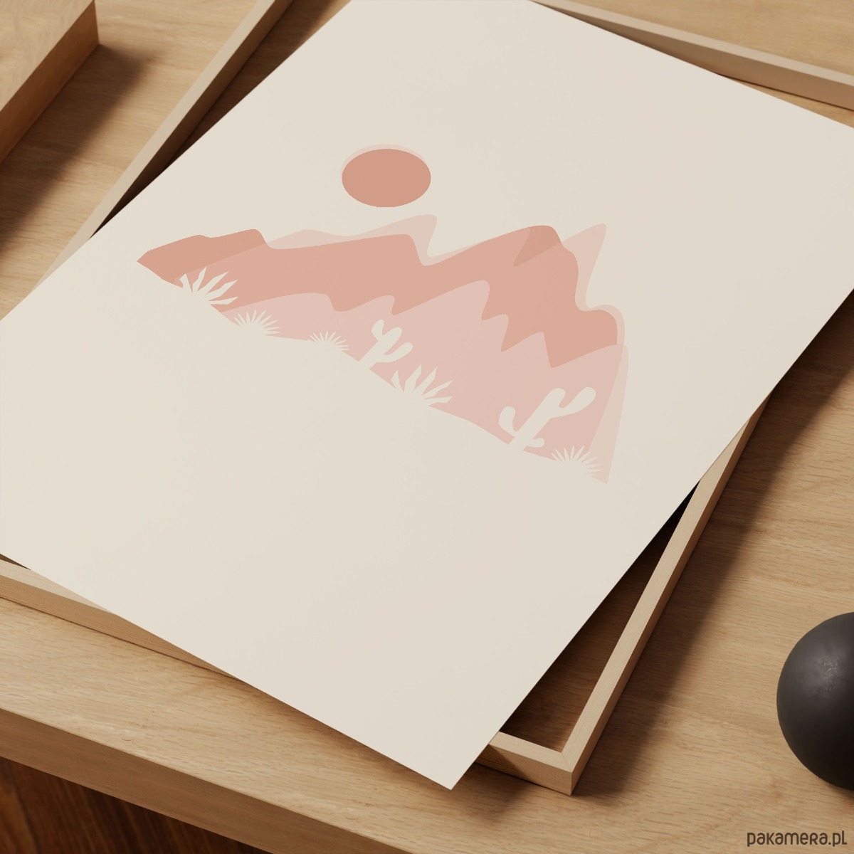 Minimalistyczny plakat ilustracyjny inspirowany pustynnym krajobrazem. Uproszczone formy słońca, kaktusa i roślinności zostały przedstawione w miękkiej, harmonijnej kompozycji. Ciepła, stonowana paleta barw nadaje grafice spokojny, ponadczasowy charakter.