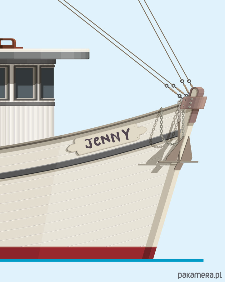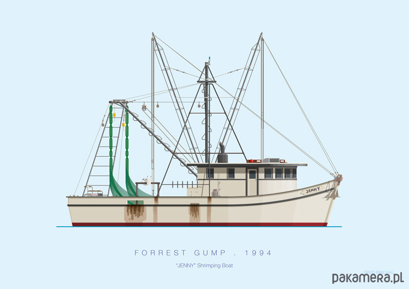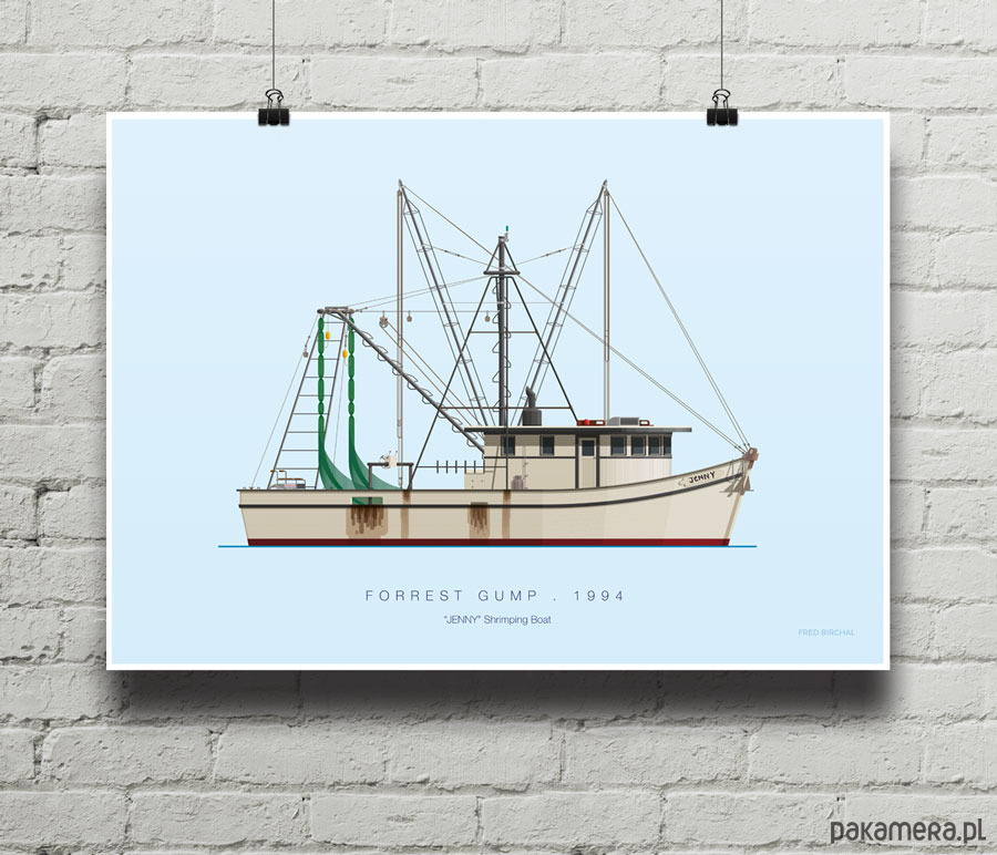 Plakat z autorską grafiką inspirowaną filmem Forrest Gump, reż. Robert Zemeckis. Pochodzi z serii "On Board" i przedstawia "Jenny" - łódź do połowu krewetek.