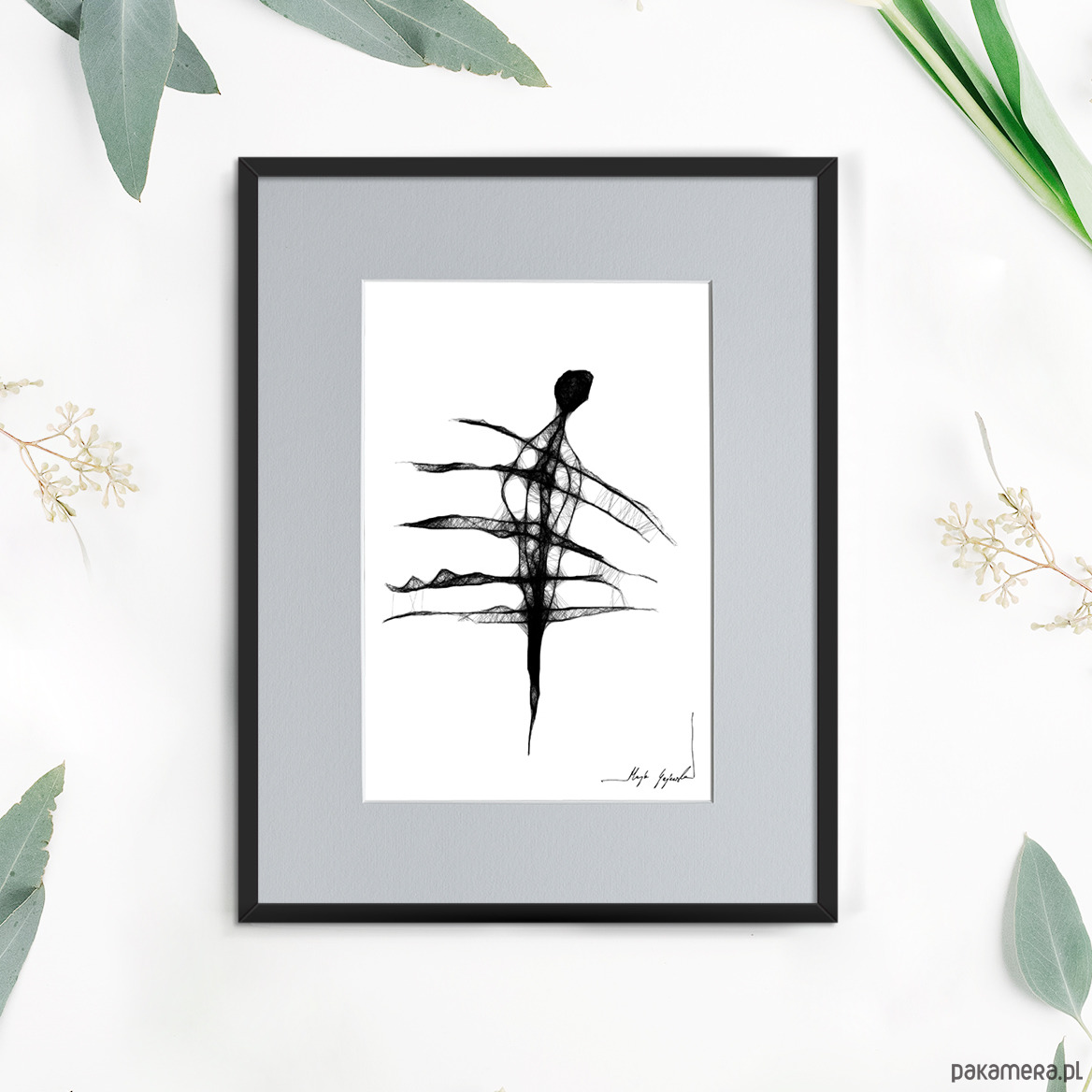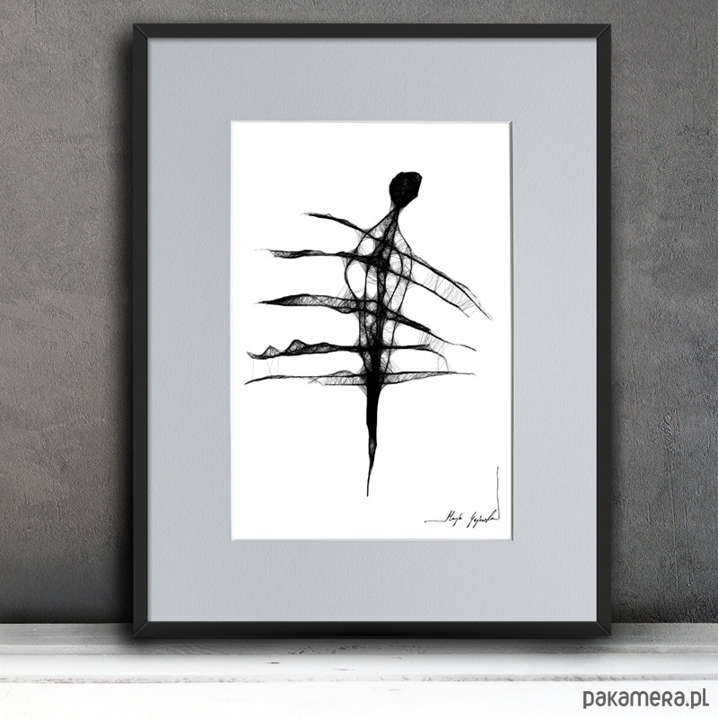 Grafika wykonana techniką mieszaną (giclée+rysunek isografem) na białym, matowym o lekko fakturowanej powierzchni, graficznym papierze Canson 250g. Unikalna kreska wygląda bardzo efektownie, zaś czarno-białe wykończenia wnętrz idealnie wpisują się puste w ściany nowoczesnych, minimalistycznych czy loftowych powierzchni.