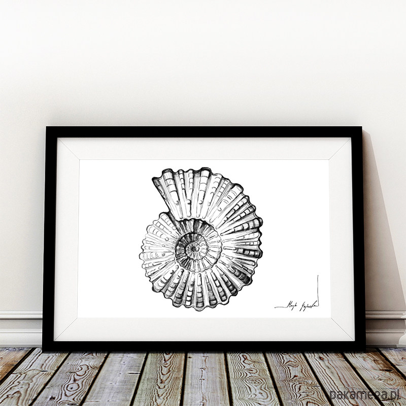 Grafika z serii "Muszle" wykonana techniką mieszaną na białym, matowym o lekko fakturowanej powierzchni, graficznym papierze Canson 160g. Gwarancja jakości w czasie długotrwałego przechowywania. Format 30x21 cm. Praca jest oprawiona - czarna, aluminiowa, satynowa rama oraz białe passe partout. Gotowa do powieszenia na ścianie.