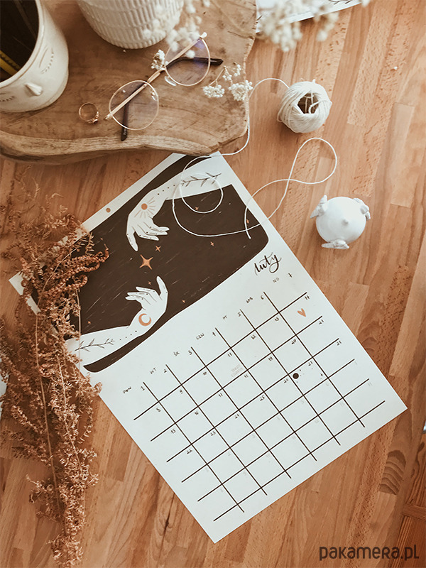 Kalendarz ścienny w formacie A3, wydrukowany na papierze z recyklingu Woodstock. Składa się z 12 kart z autorskimi ilustracjami. Dodatkowo zamiast metalowej spirali jest złączony sznureczkiem, dzięki czemu karty można wieszać osobno, można je również przykleić lub przyczepić, co jest świetnym rozwiązaniem, jeśli ktoś nie ma możliwości wbicia gwoździa!
