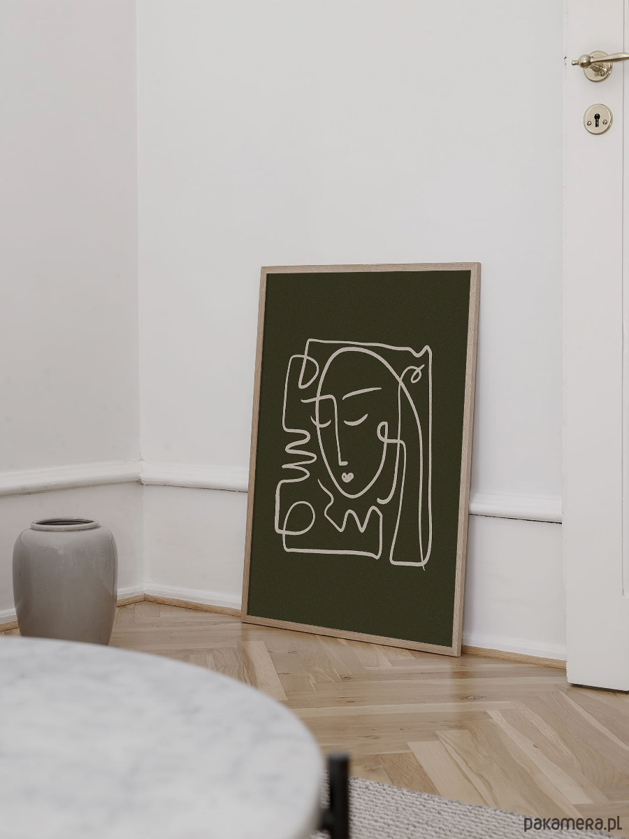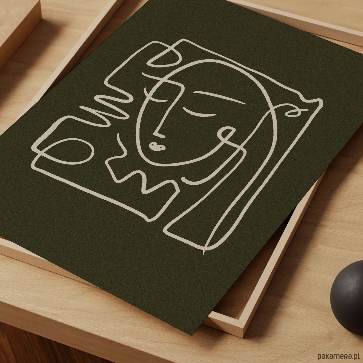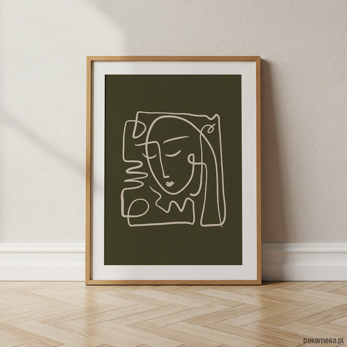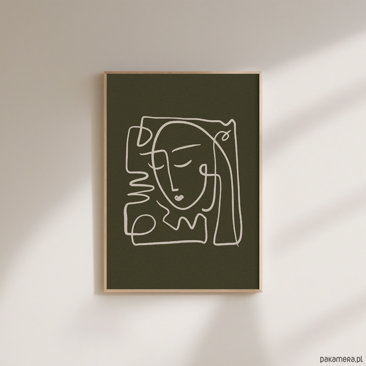 Minimalistyczny plakat z portretem wykonanym jedną, ciągłą linią. Prosta forma i oszczędna kreska tworzą spokojną, elegancką kompozycję inspirowaną sztuką nowoczesną i rysunkiem odręcznym. Subtelny kontrast jasnej linii na głębokim, stonowanym tle nadaje grafice ponadczasowy charakter.
