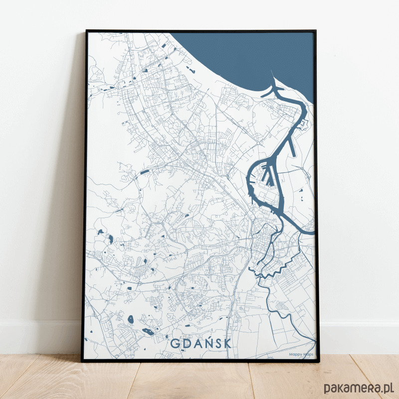 Mapa plakat miasta Gdańsk. Plakat przedstawia centralną część miasta wraz zaznaczonymi głównymi ulicami. Mapa będzie oryginalną dekoracją wnętrza przywołującą wspomnienia. Dobrze komponuje się z wnętrzami minimalistycznymi, skandynawskimi czy industrialnymi.