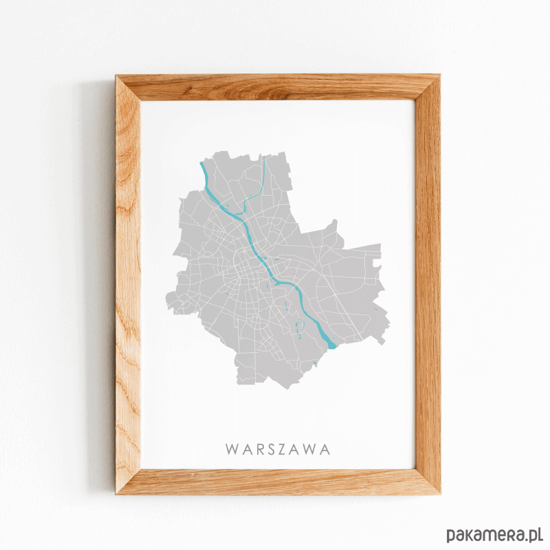 Mapa grafika Warszawy. Mapa przedstawia granice miasta z zaznaczonymi głównymi ulicami, rzekami i jeziorami. Mapa będzie oryginalną dekoracją wnętrza przywołującą wspomnienia. Dobrze komponuje się z wnętrzami minimalistycznymi, skandynawskimi czy industrialnymi.