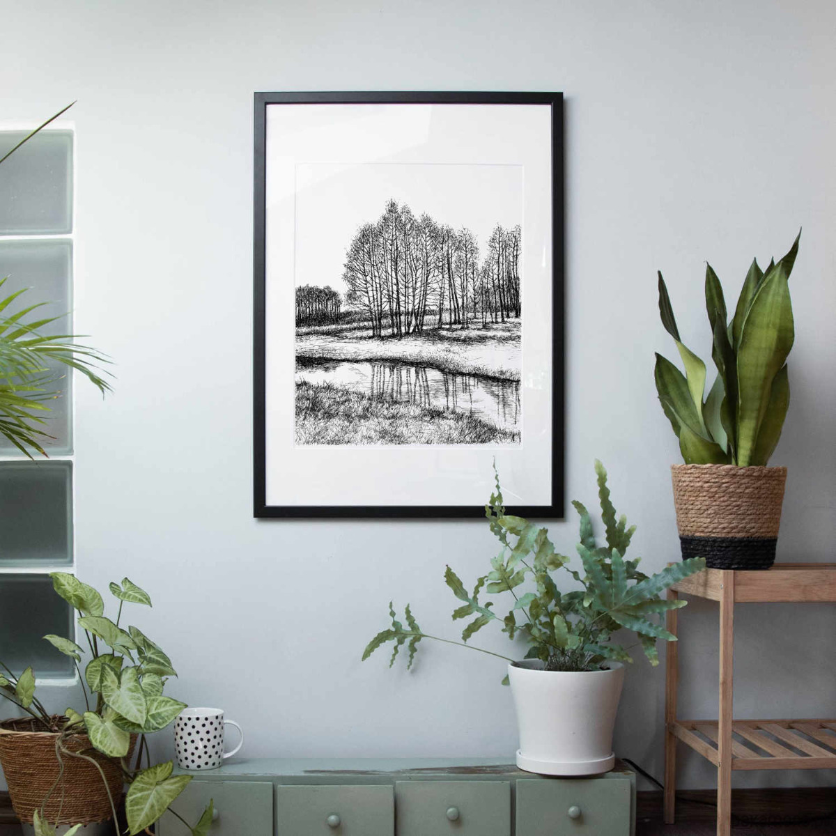 Autorska grafika wykonana czarnym tuszem.