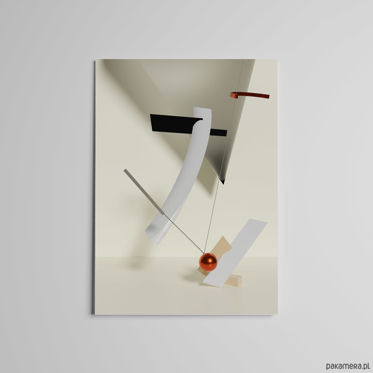3D grafika na papierze, oparta na założeniach Bauhausu. Plakat, na którym znajduje się minimalistyczna kompozycja cyfrowa. Powieś go w swoim ulubionym pomieszczeniu i poznaj nowy wymiar ukryty w ramie.