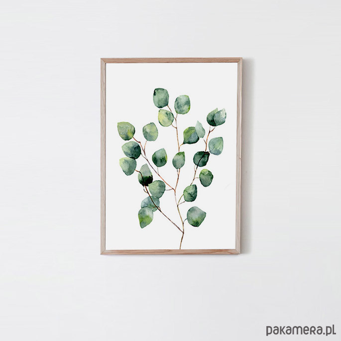 Plakat z serii Botanic z liściem Eukaliptusa wykonanym techniką akwareli.