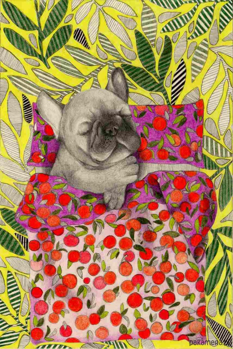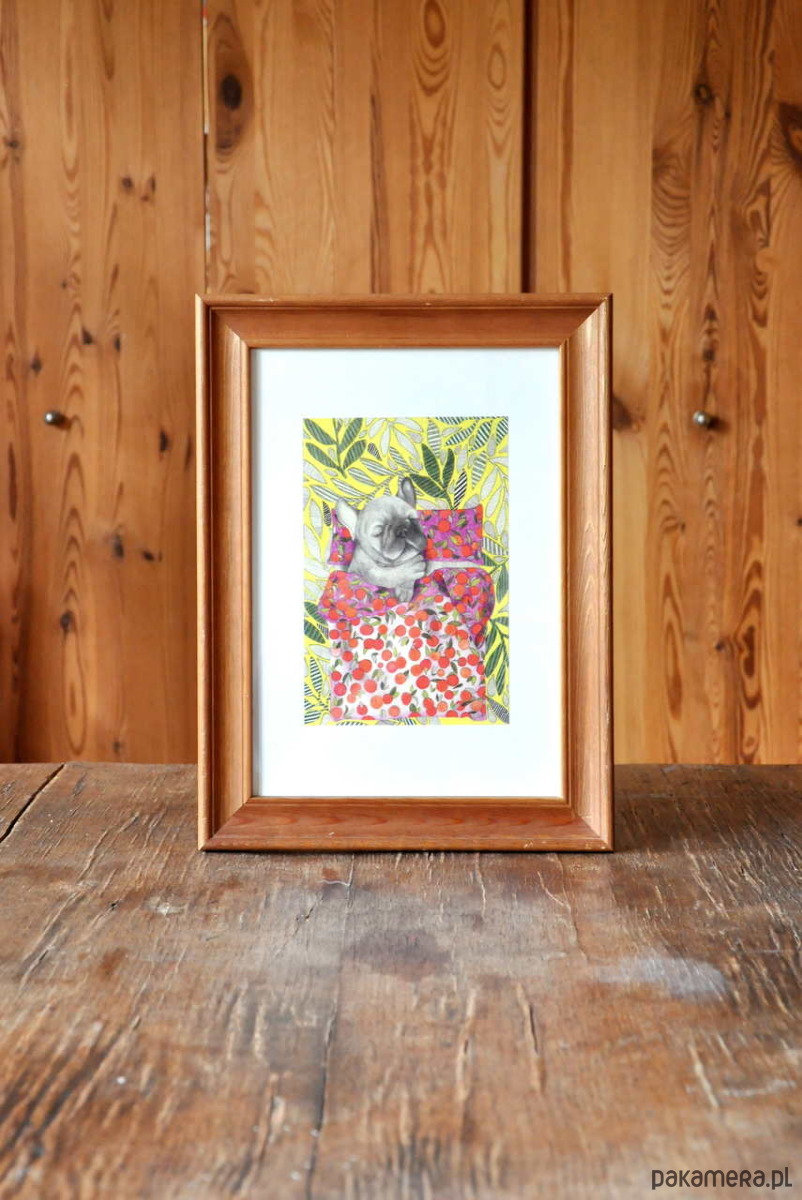 Sczeniaczek otulony kołderką, wyjątkowy przedruk autorskiej, rysunkowej ilustracji z serii "Śpiące słodziaczki". Idealny do dziecięcej sypialni.