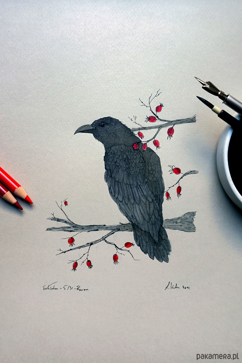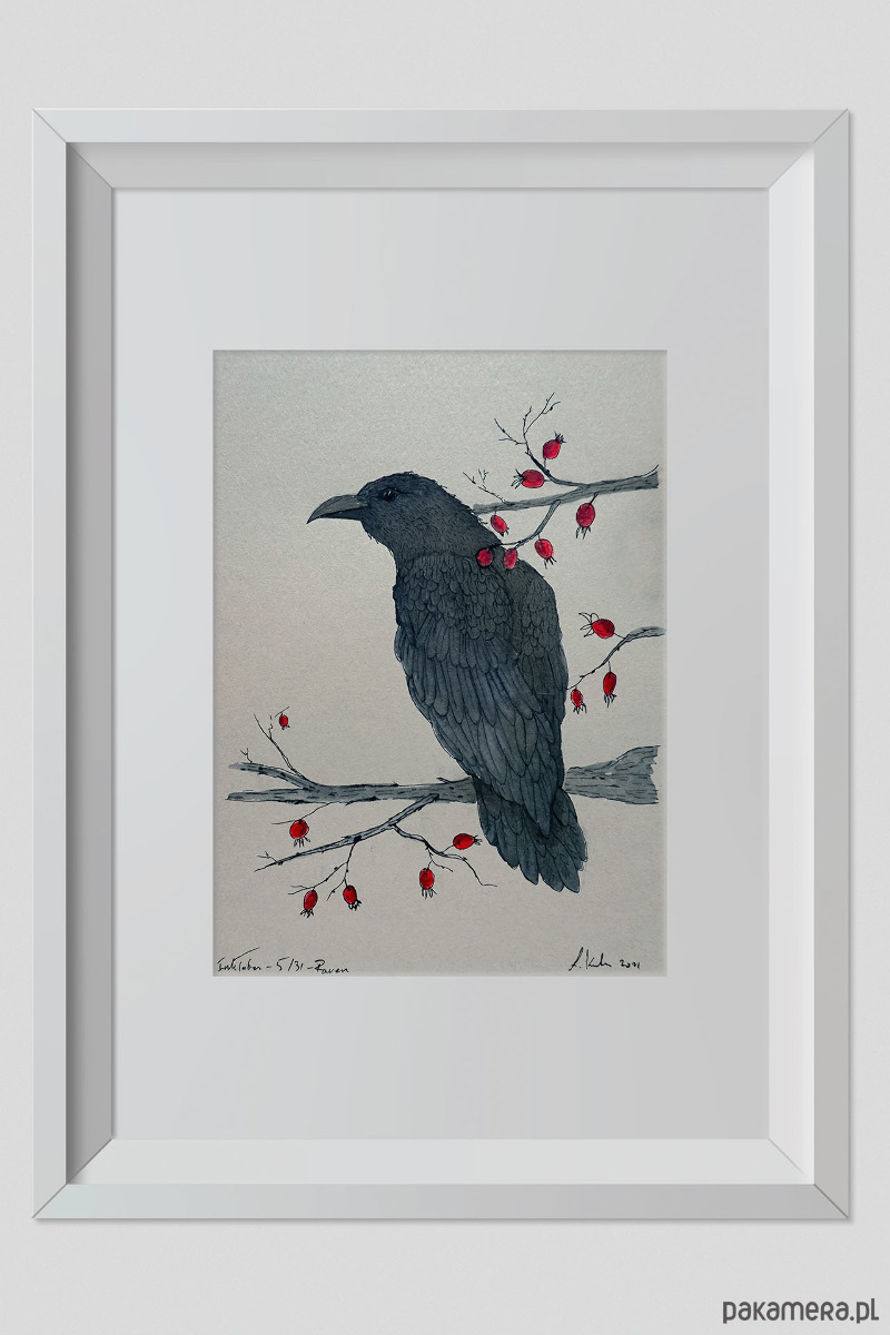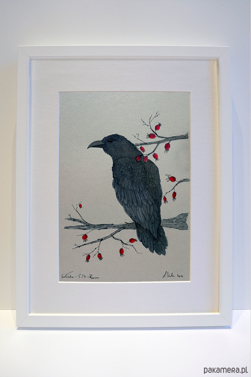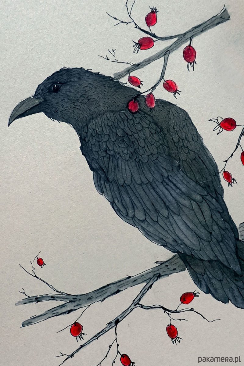 Rysunek przedstawia Kruka zwyczajnego / łac. Corvus corax siedzącego na gałęzi dzikiej róży. Kolorystyka ogranicza się do czerni tuszu i odcieni czerwieni kredek. Kompozycja zamknięta rysunku tworzy przejrzysty i jasny układ, który dodaje przestrzeni. Ograniczenie w użyciu barw sprawia, że rysunek jest minimalistyczny, a sama grafika wychodzi na pierwszy plan.