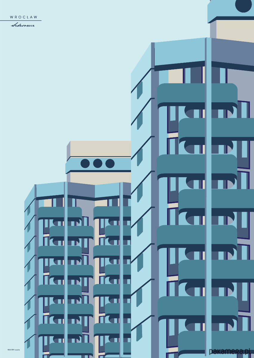 Plakat z serii wrocławskiej, przedstawiający budynki modernistycznego osiedla, zwane Sedesowcami lub wrocławskim Manhattanem.