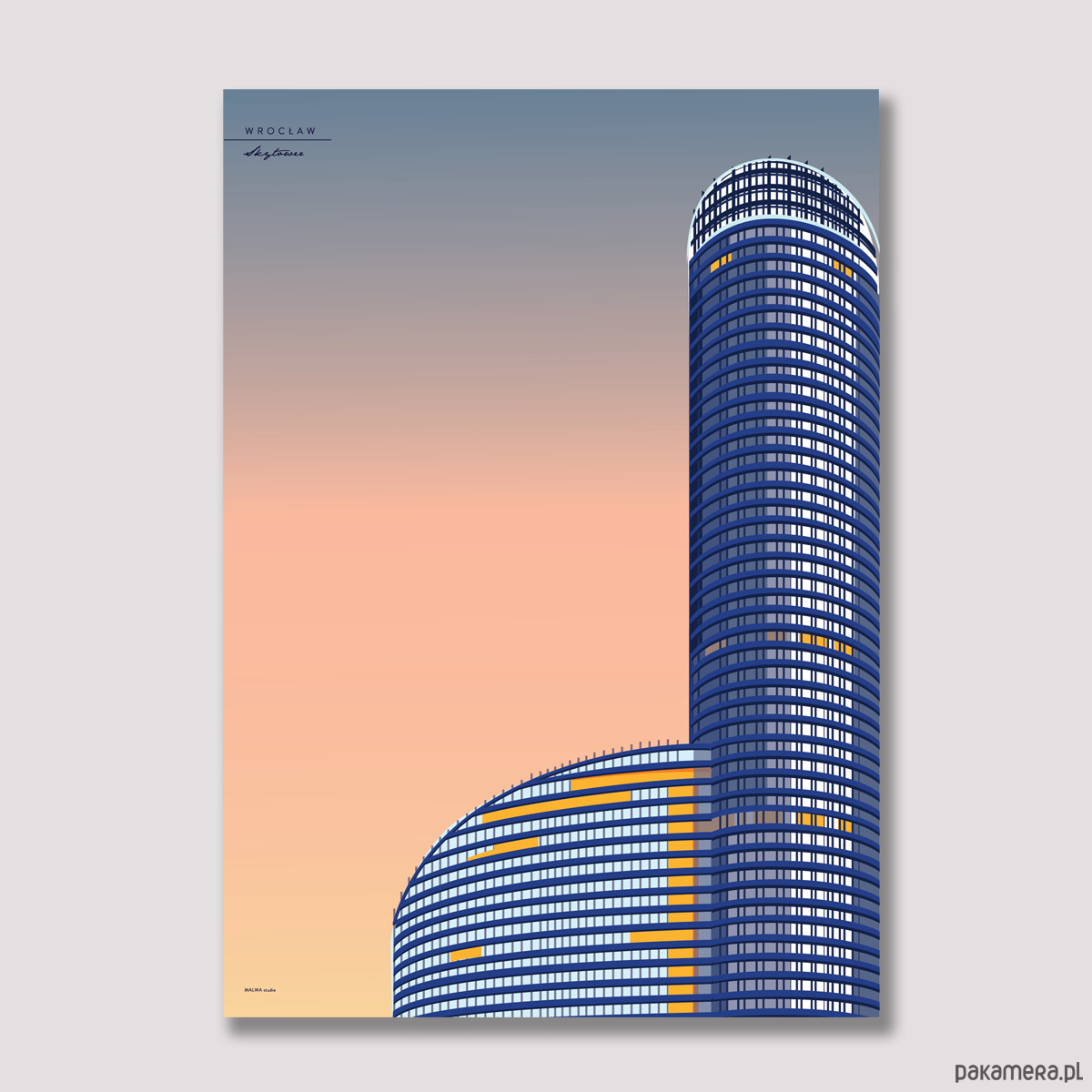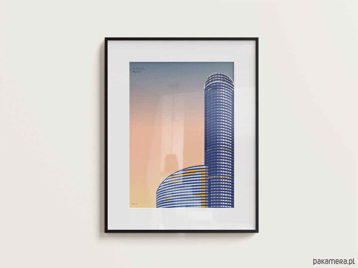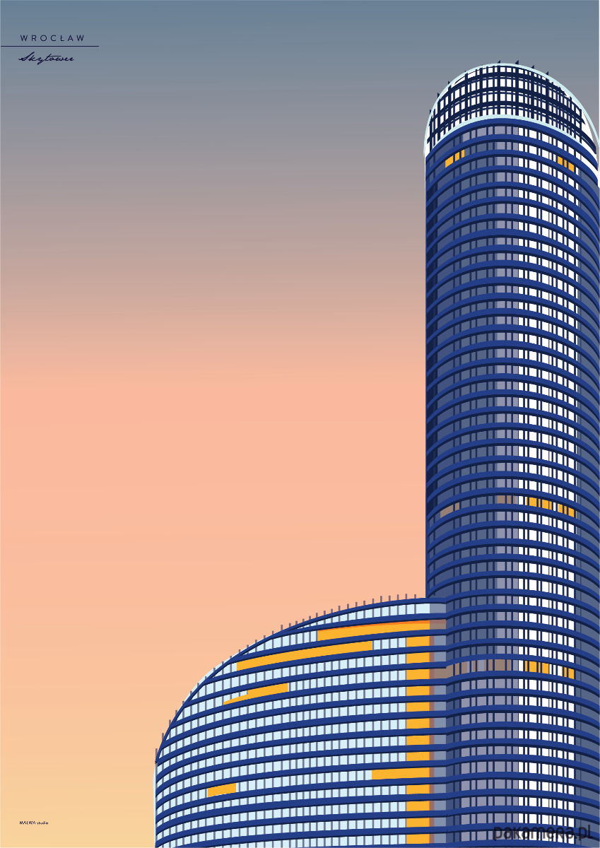 Plakat z serii wrocławskiej, przedstawiający biurowiec Skytower.