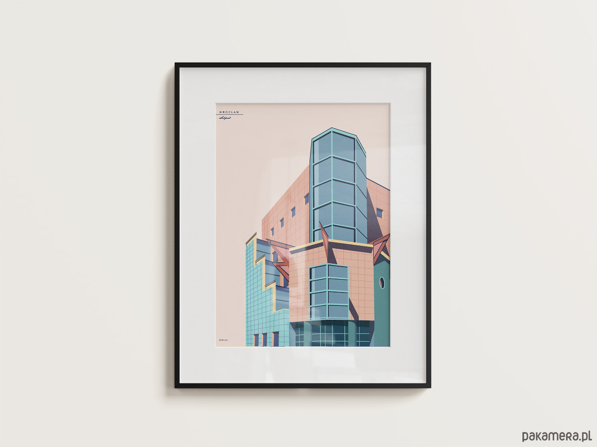 Plakat z serii wrocławskiej, przedstawiający postmodernistyczny dom handlowy Solpol.