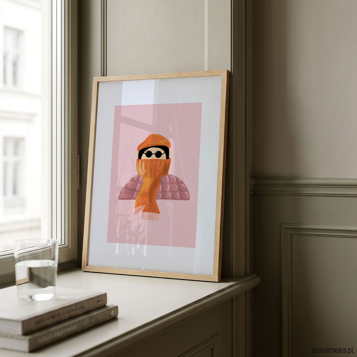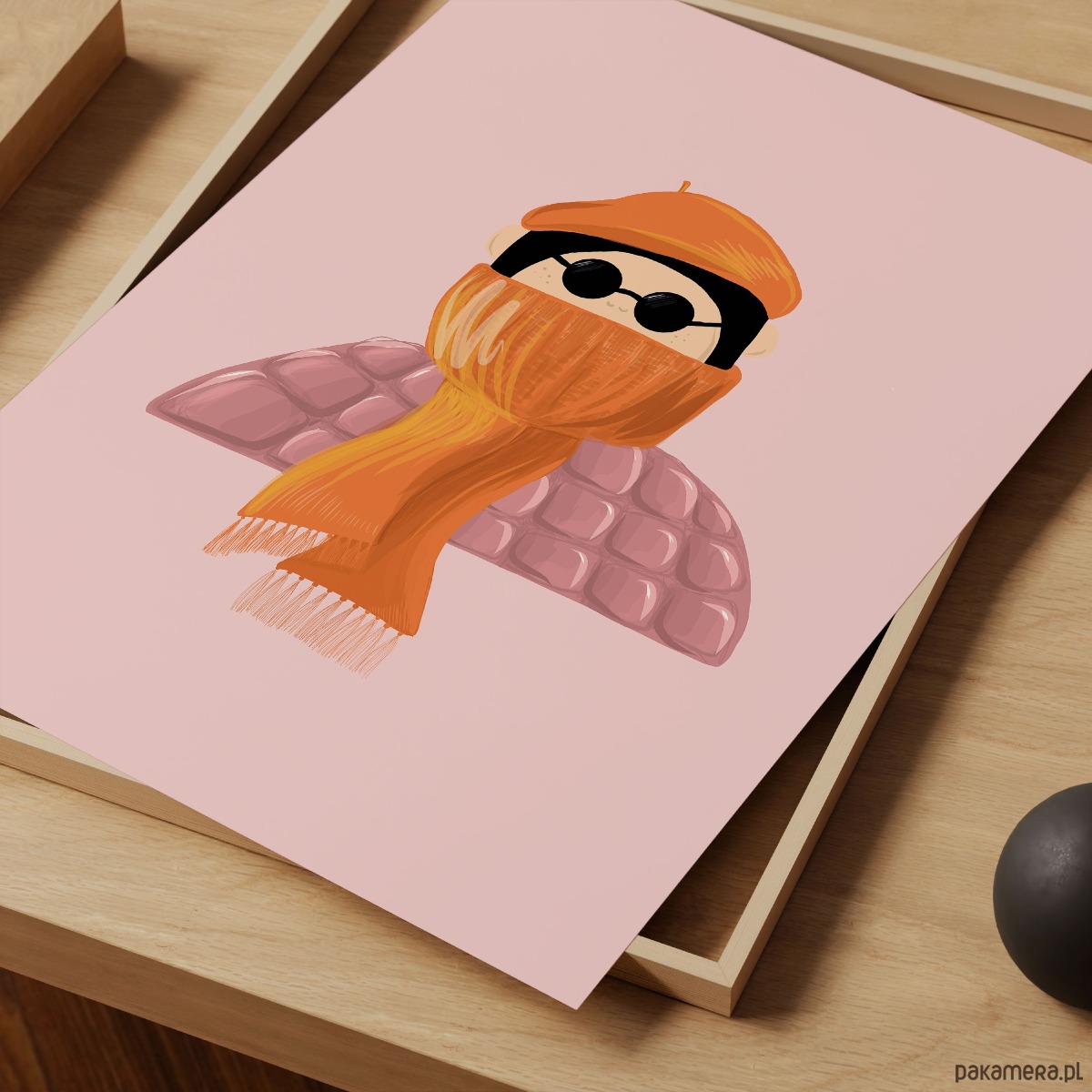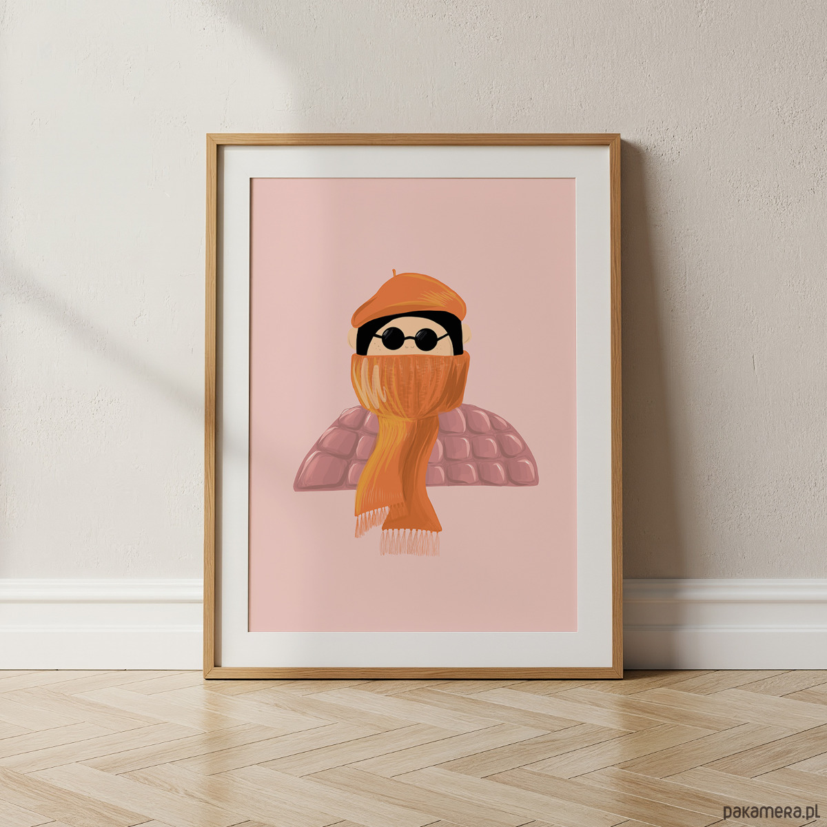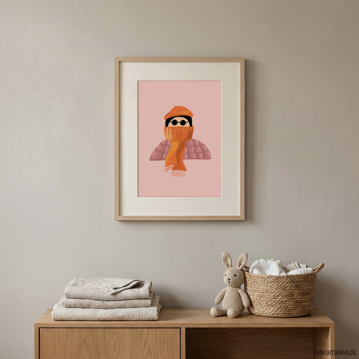 Uroczy, ilustracyjny plakat przedstawiający postać w zimowym stroju. Prosta forma, miękkie kształty oraz ciepła, pastelowa kolorystyka w odcieniach różu, brzoskwini i pomarańczu tworzą przyjazną, pogodną kompozycję idealną do dziecięcego wnętrza.