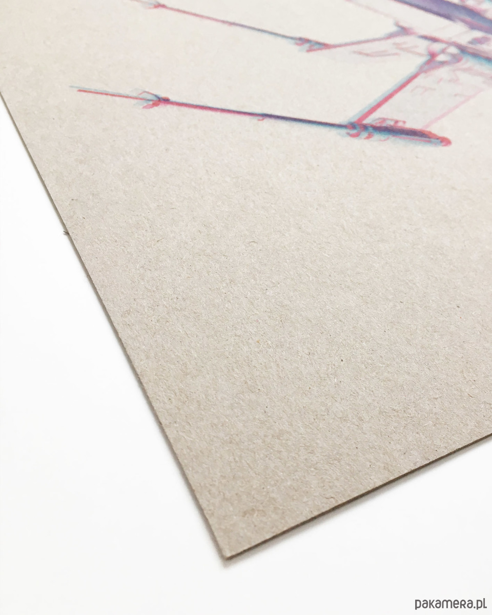 Wydruk na grubej tekturze / szarym kartonie introligatorskim (grubość 1,5 - 2 mm) przycięty tak, by pasował do standardowych ramek 30 x 40 cm.