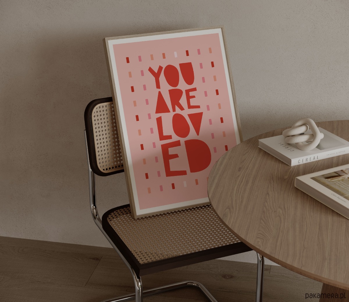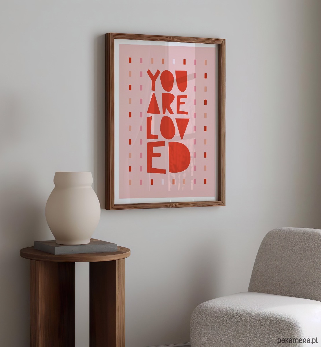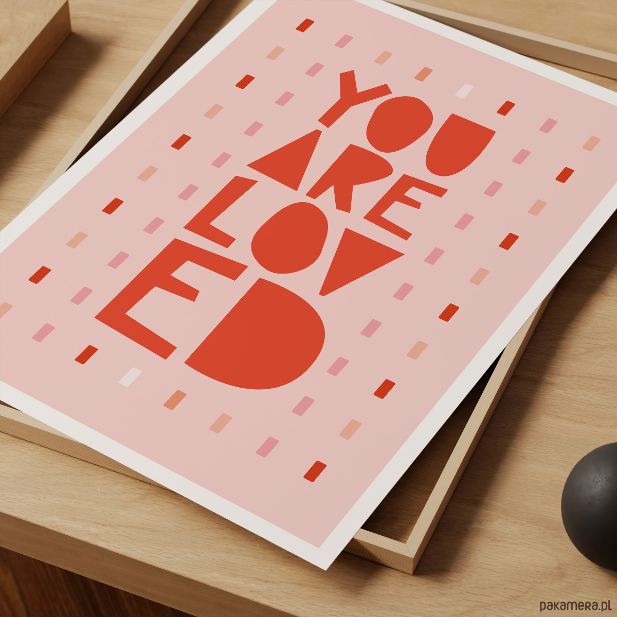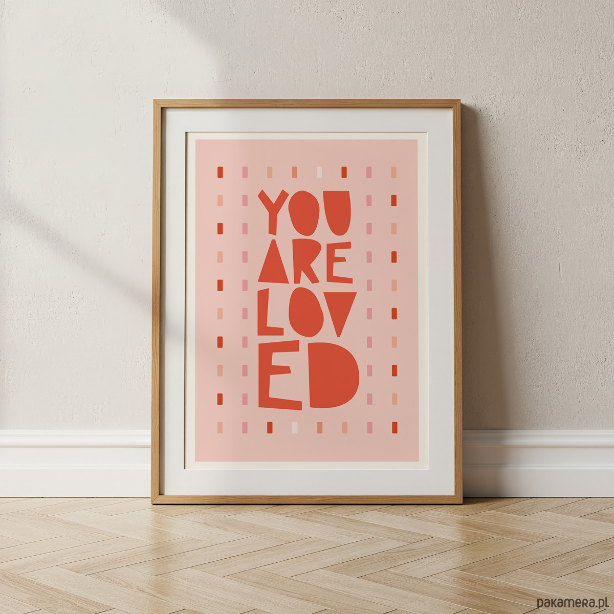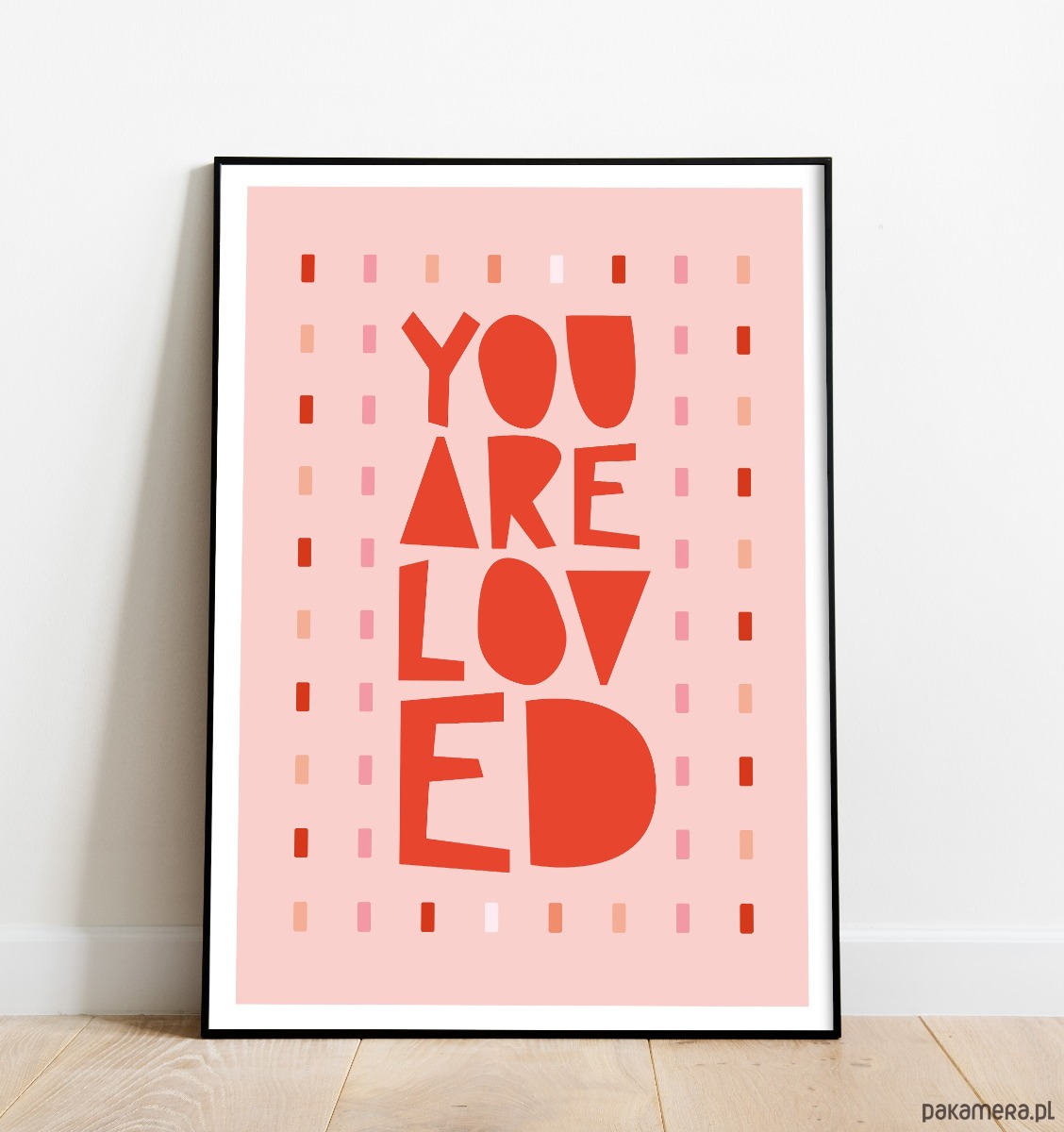 Plakat typograficzny z hasłem „You Are Loved” w ciepłej, różowo-czerwonej kolorystyce. Nowoczesna, lekko zabawna typografia połączona z delikatnym, dekoracyjnym tłem tworzy pozytywną i emocjonalną kompozycję, która przyciąga wzrok i wprowadza do wnętrza dobrą energię.