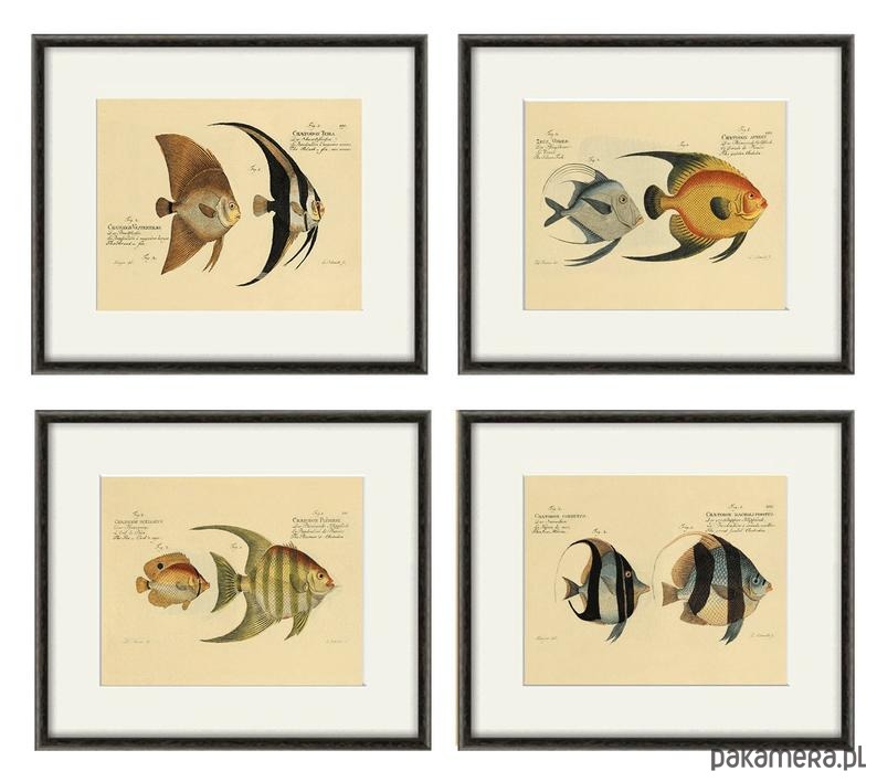 Zestaw 4 grafik przedstawiający ryby egzotyczne motywy morskie z XIX w. Reprint odrestaurowany cyfrowo wygląda jak oryginał z epoki.