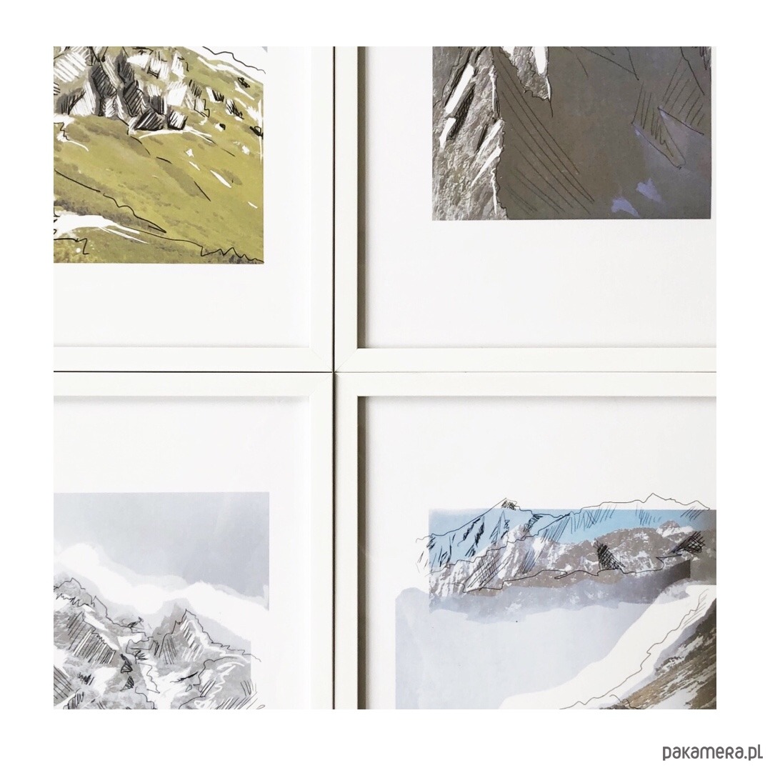Grafiki oprawione w minimalistyczne białe ramy (zbliżenie w ostatnim zdjęciu)