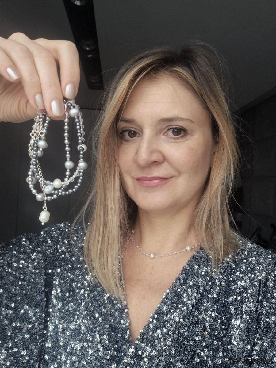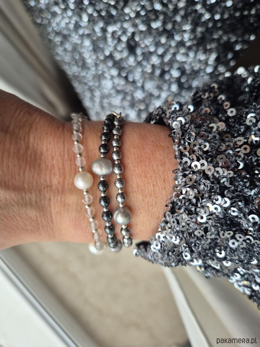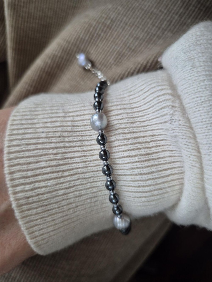Najbardziej wyrazisty element kolekcji Cristal. Głęboki połysk grafitowych hematytów kontrastuje z chłodną szarością naturalnych pereł, nadając całości nowoczesny, elegancki charakter. Regulowany łańcuszek z zawieszką sprawia, że bransoletka świetnie prezentuje się zarówno noszona solo, jak i w zestawieniu z innymi elementami kolekcji.