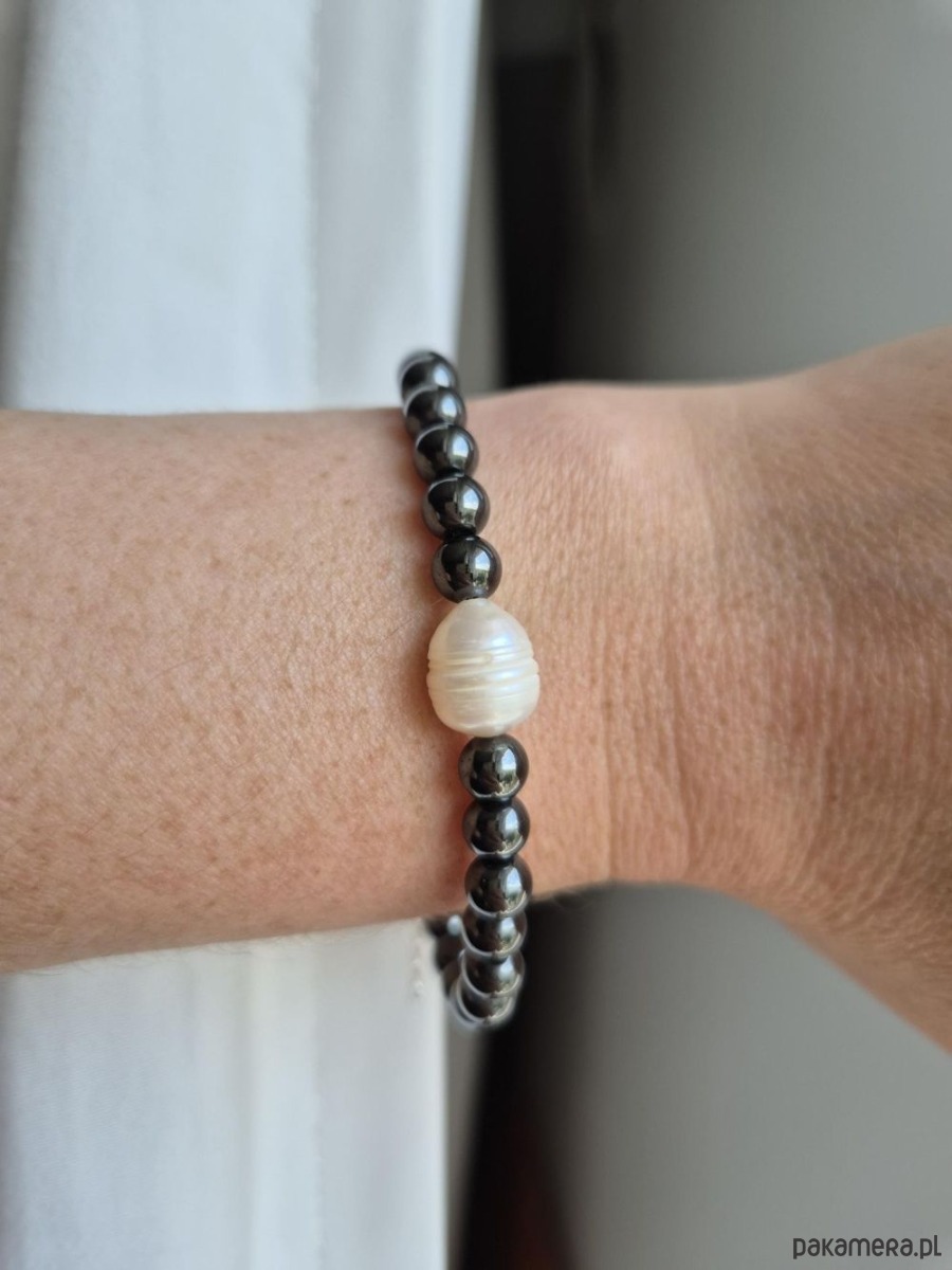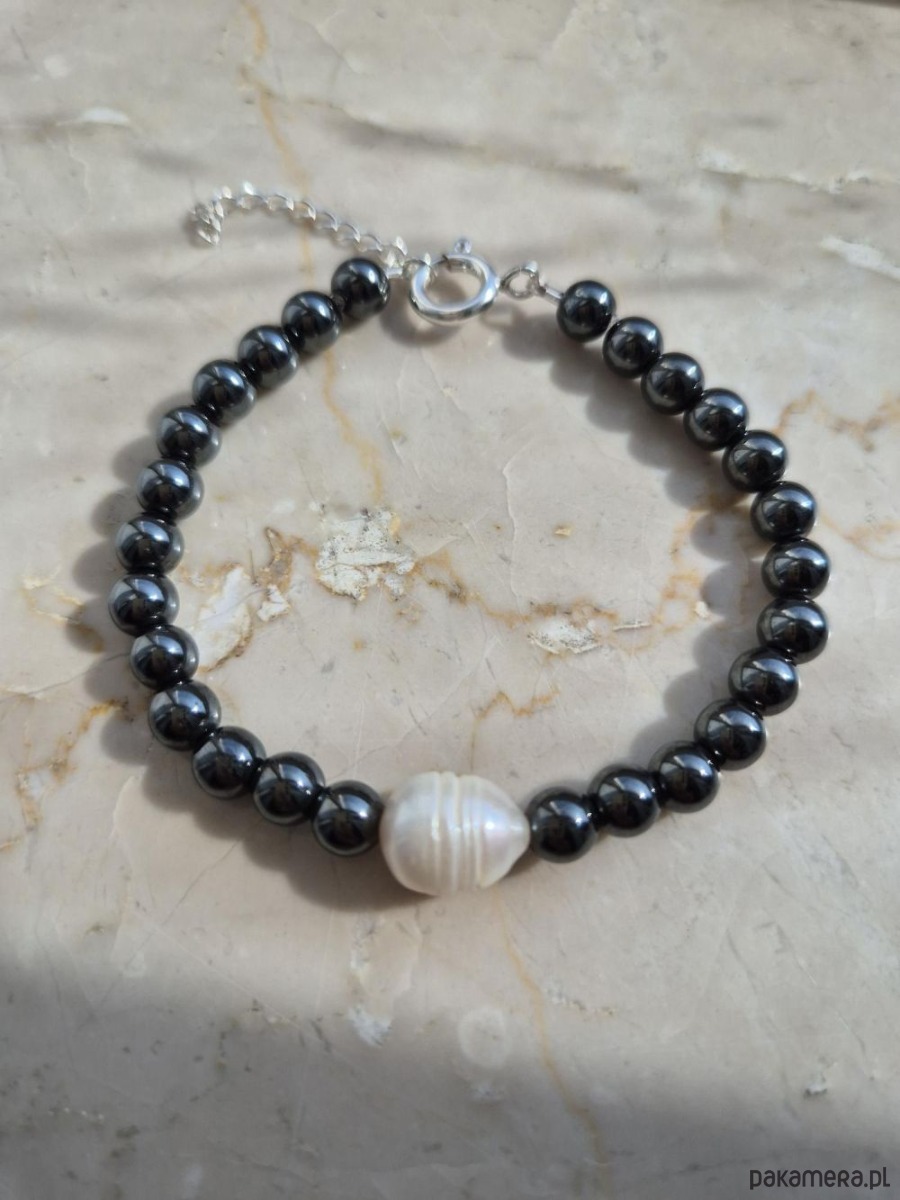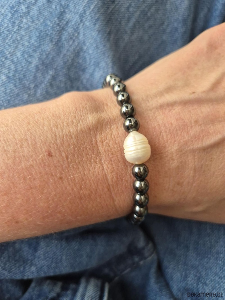 Bransoletka została wykonana ręcznie z błyszczących, grafitowych kamieni naturalnych - hematytów, centralny punkt naszyjnika stanowi naturalna, biała perła, a lekkości dodaje jej łańcuszek ze srebra będący jednocześnie przedłużką. Sprawdzi się jako codzienna bransoletka do dżinsów, jak i wieczorowa do eleganckich stylizacji.