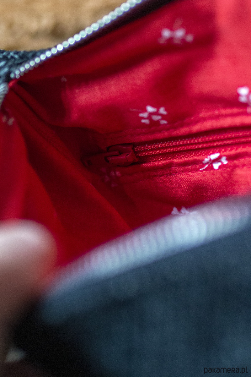 Małe zaszewki na dnie. Z tyłu oraz w środku torebki kieszonki zapinane na suwak. Środek wykończony bawełnianą podszewką.