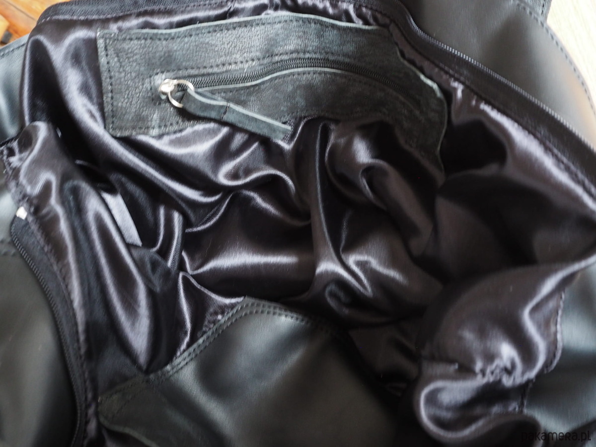Uchwyty 61 cm. W środku podszewka; wewnątrz duża kieszeń na zamek i mniejsza naszywana skórzana na telefon.