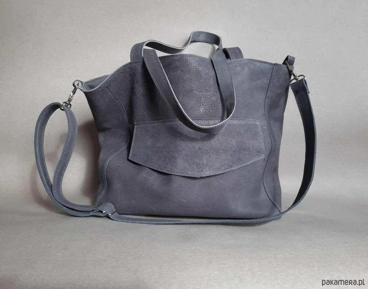 Duża, uszyta ze skóry naturalnej typu nubuk w kolorze grafitowym skręcającym w stronę niebieskiego.