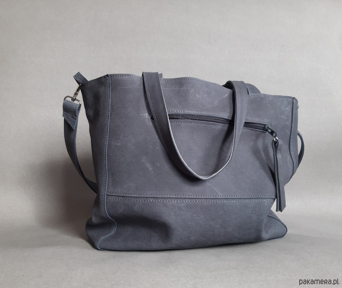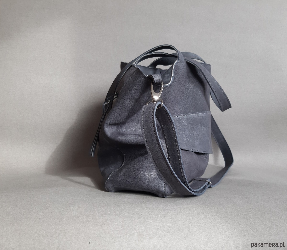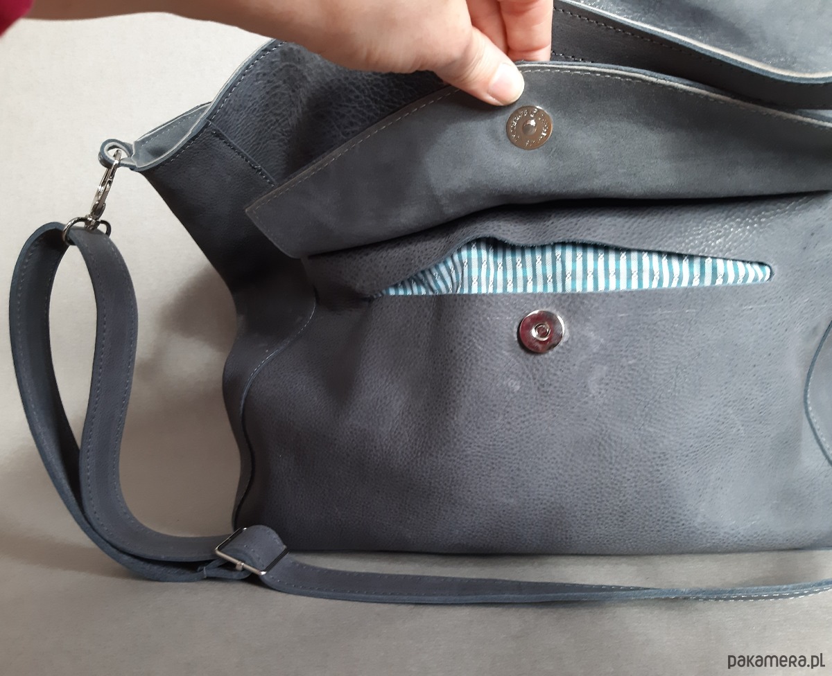 Duża, uszyta ze skóry naturalnej typu nubuk w kolorze grafitowym skręcającym w stronę niebieskiego.