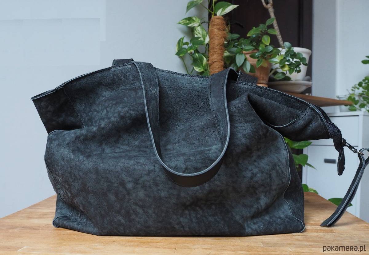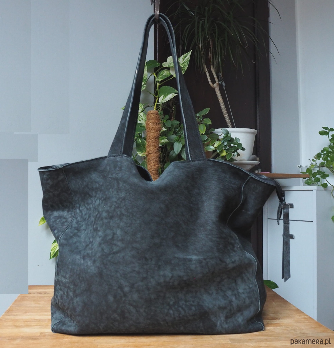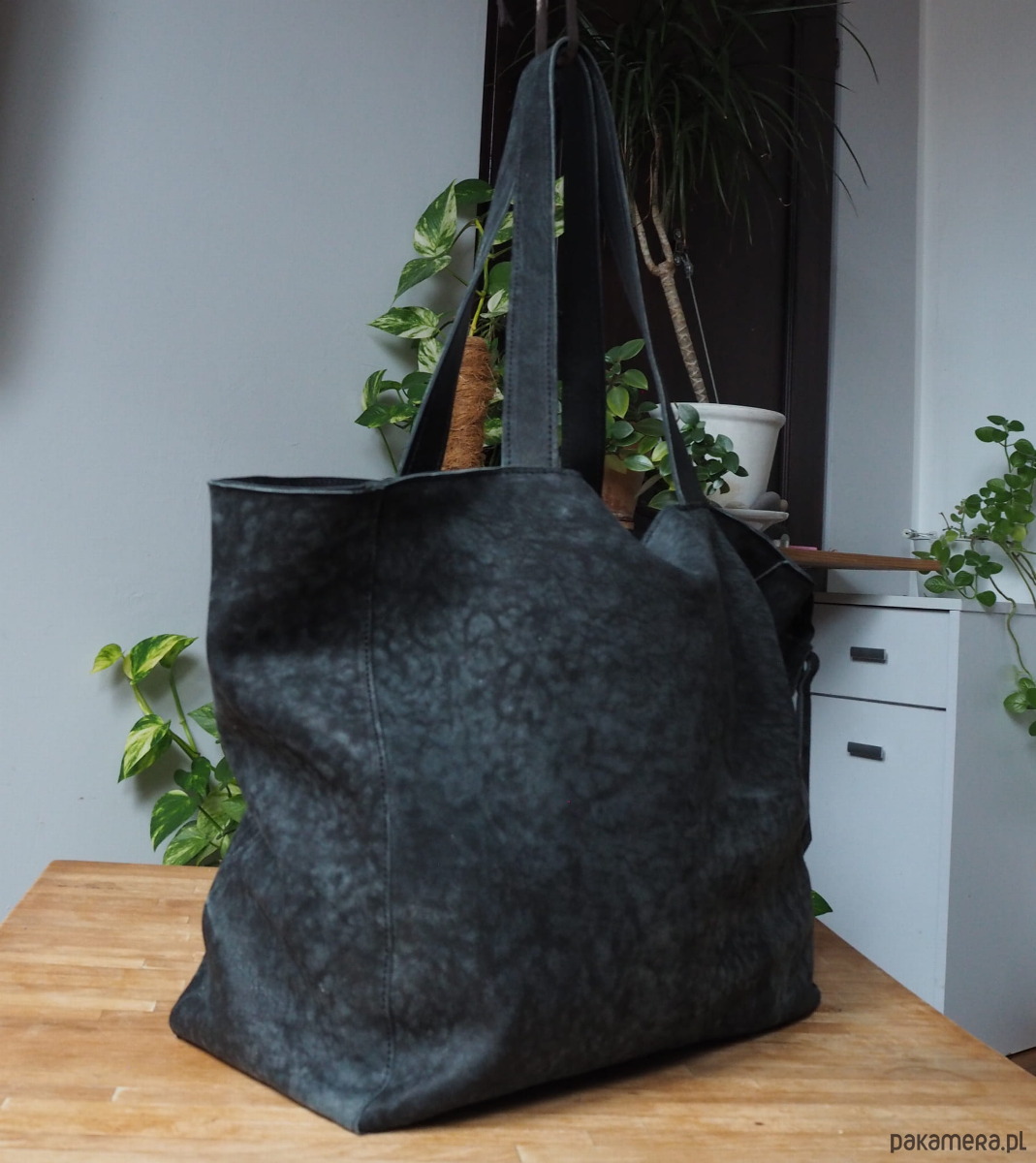 Skórzana torba w kolorze ciemno szarym, właściwie grafitowym.