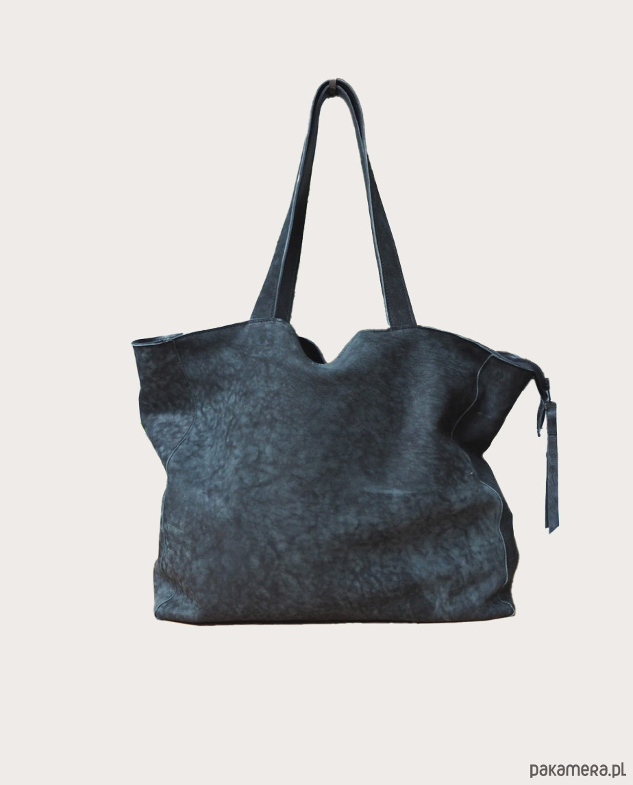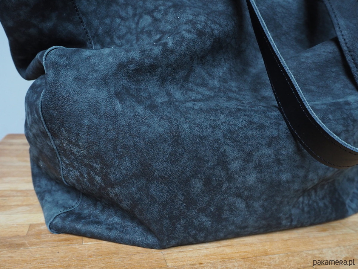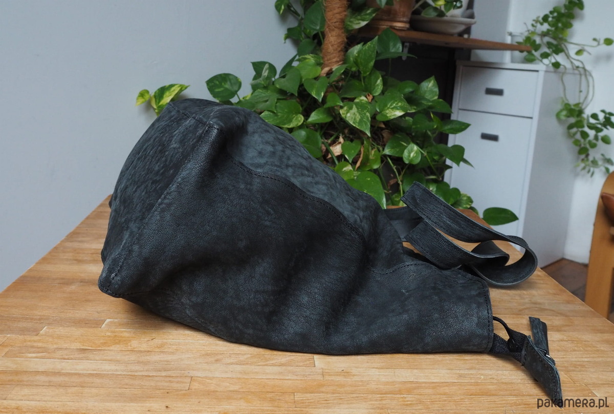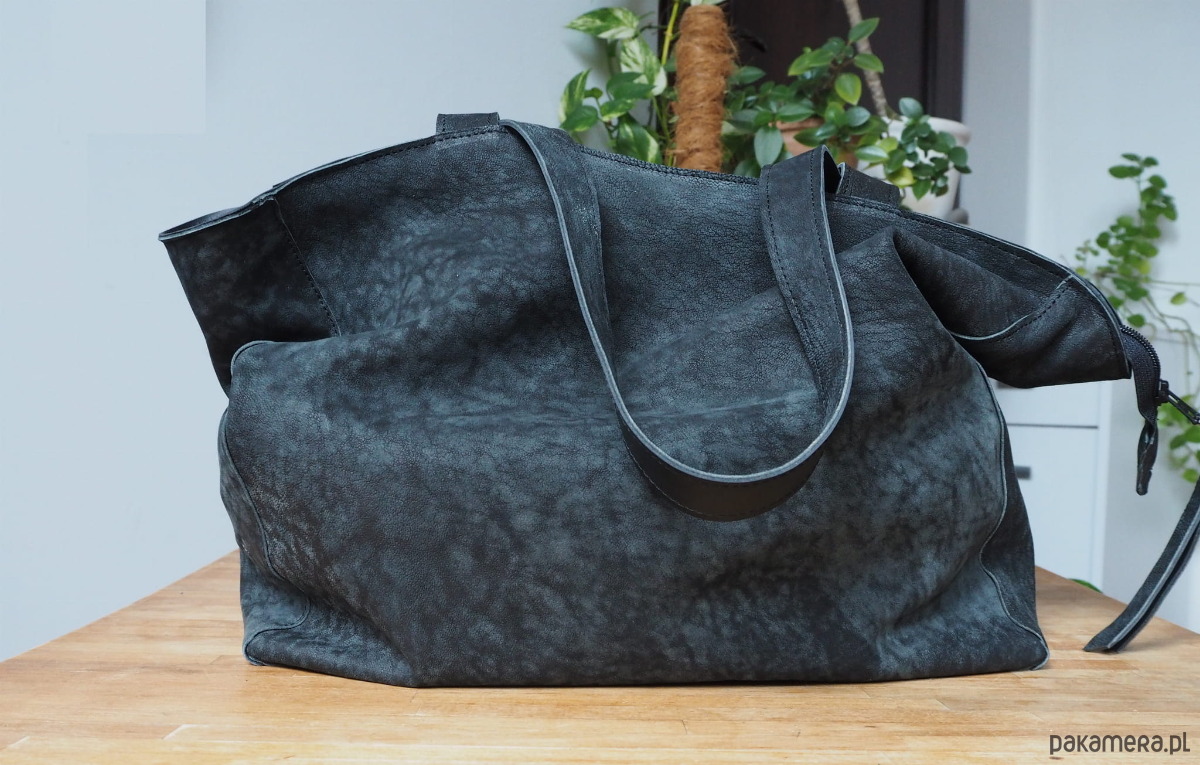 Skórzana torba w kolorze ciemno szarym, właściwie grafitowym.
