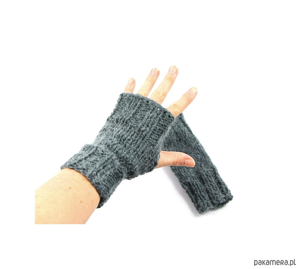 Cieplutkie mitenki zrobione na drutach z włóczki w kolorze grafitowym. Z boku mają otwór na kciuk.
