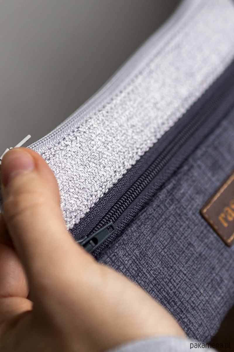 Prosty wodoodporny portfel wykonany z kilku rodzajów tkanin w odcieniach szarości.