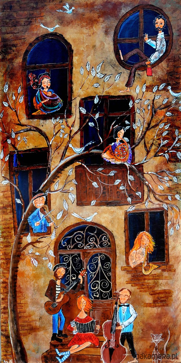 "Granada por la noche" - akryle i kolaż na płótnie. Wystawiony przedmiot to wydruk na płótnie naciągniętym na drewnianą ramę, gotowy do powieszenia na ścianę. 30x60 cm.
