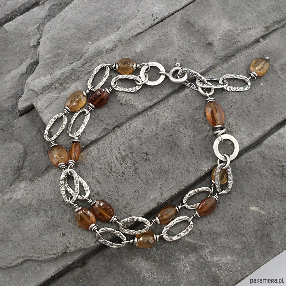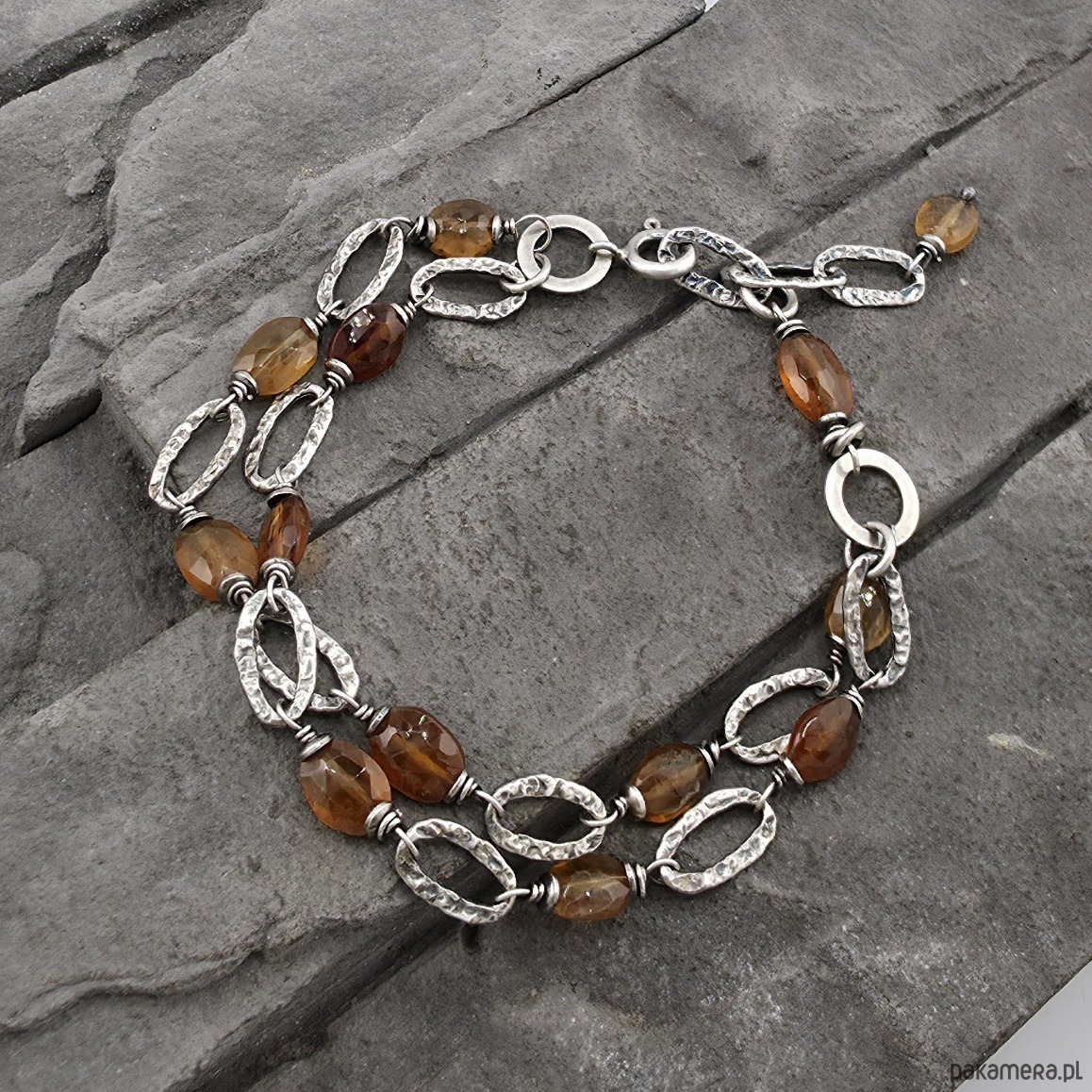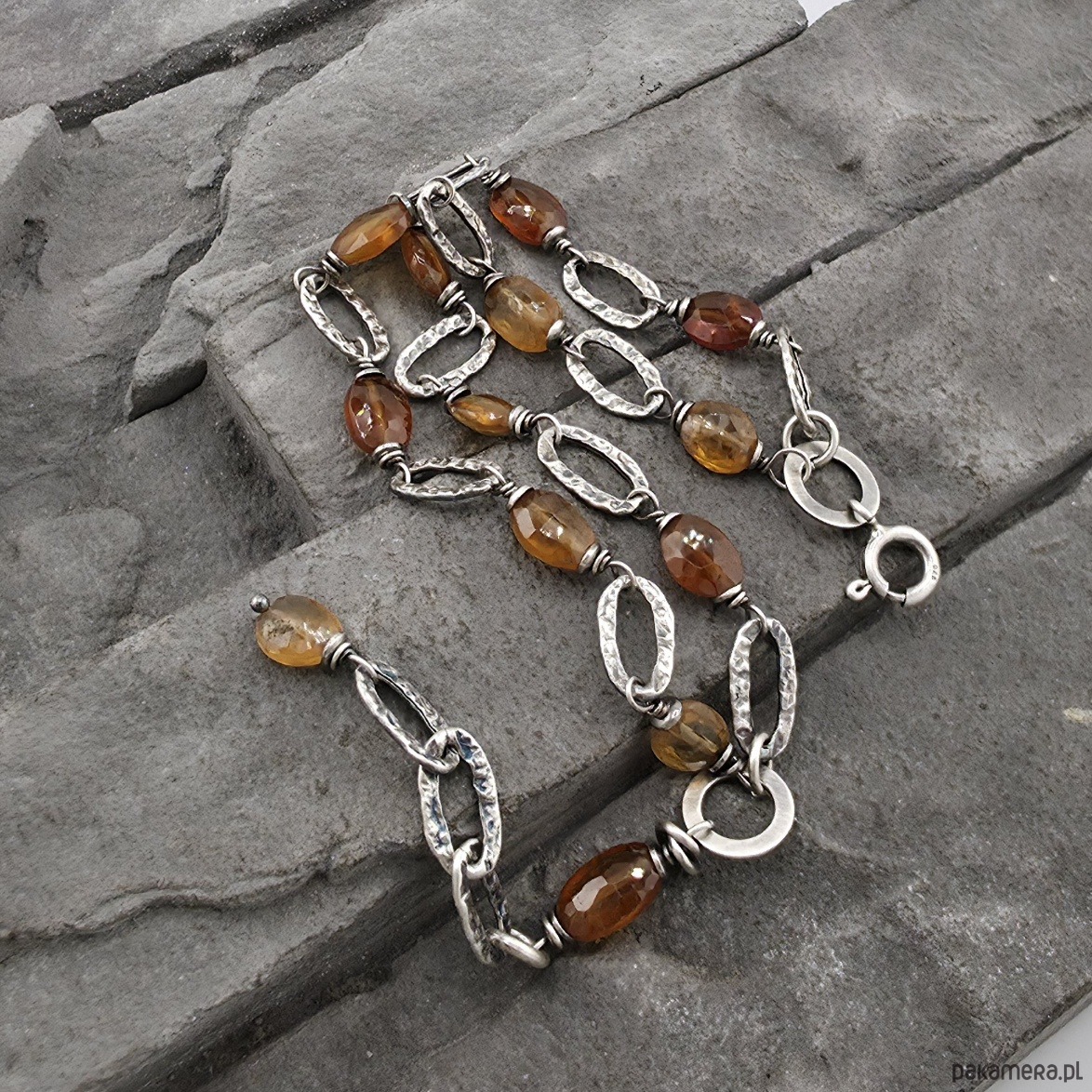 Modna i kobieca bransoletka na co dzień i nie tylko. Wykonana w całości z oksydowanego srebra próby 925 oraz fasetowanych owali granatu hessonit wielkosci 7-9 mm. Wielkość ogniw łańcuszka to 11x5,5 mm. W mojej galerii jest dostepny naszyjnik do kompletu. Całkowita długość bransoletki to 18 cm plus regulacja 2,5 cm. Ozdobnie zapakowana.