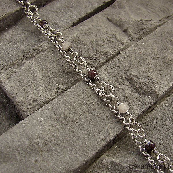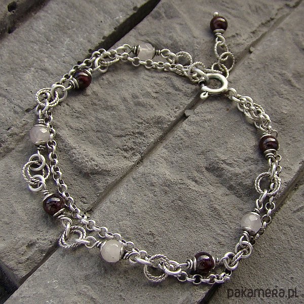 Delikatna, kobieca i wyjątkowa bransoletka na co dzień i nie tylko. Wykonana w całości z oksydowanego srebra próby 925 oraz kulek granatu i mlecznego jadeitu wielkości ok. 4,5 mm. Całkowita długość bransoletki regulowana od 18,5 cm do 20,5 cm. Ozdobnie zapakowana.