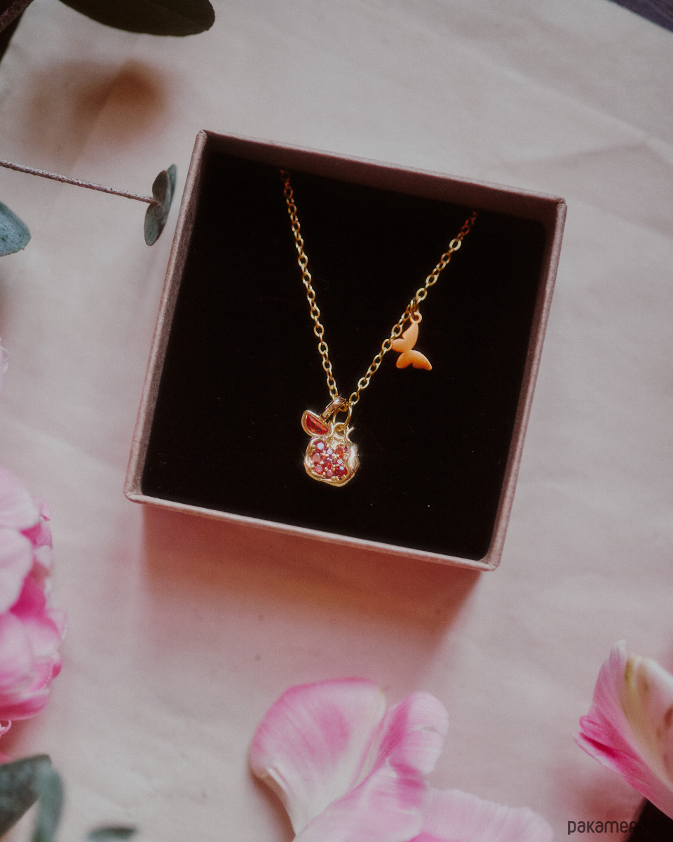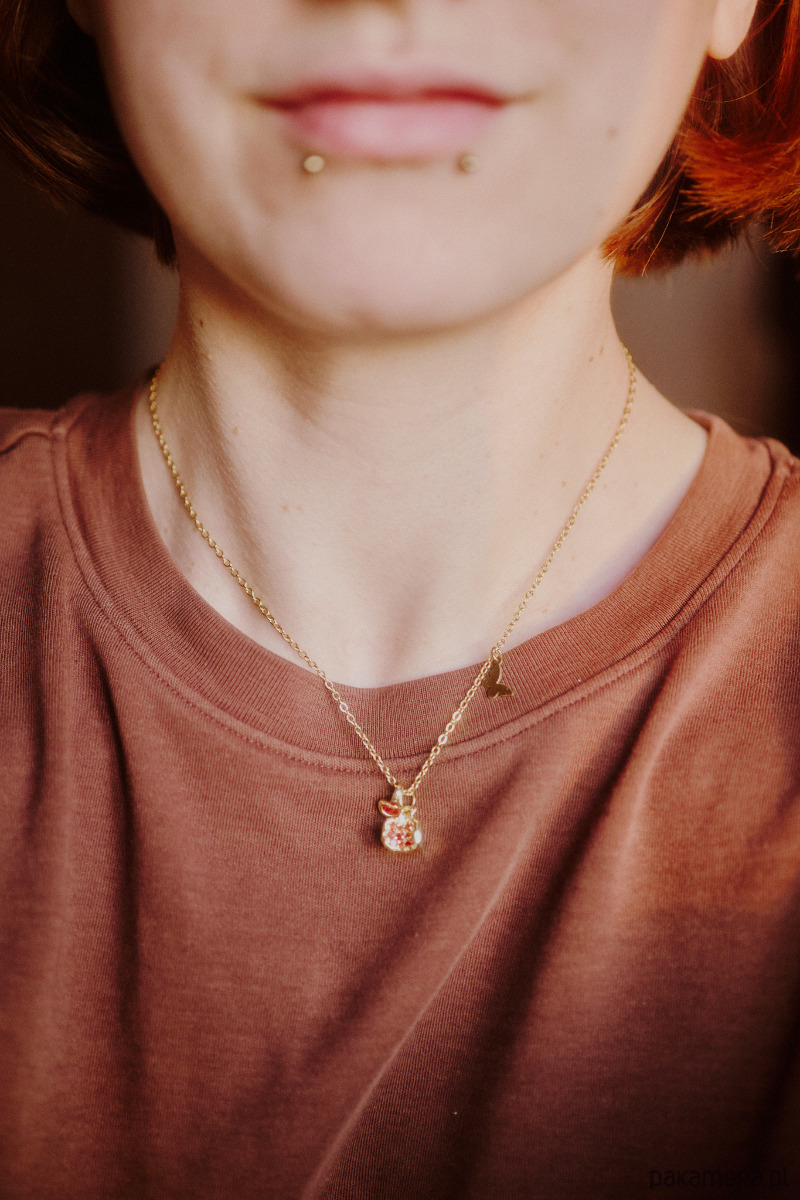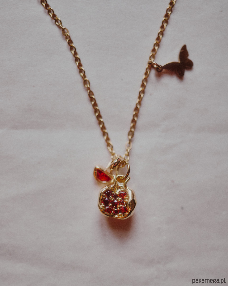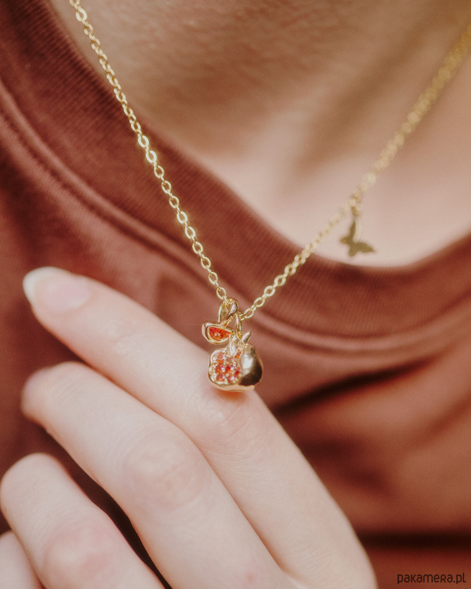 Delikatny naszyjnik dla wróżki. Pozłacany granat i cyrkonia w kolorze pomarańczowym. Do tego motylek, zapięty tak, że nie przemieszcza się po łańcuszku robiąc przestrzeń dla głównych zawieszek. Na przedłużce kuleczka cyrkonii. Uroczy dodatek do zakładania solo lub warstwowania.