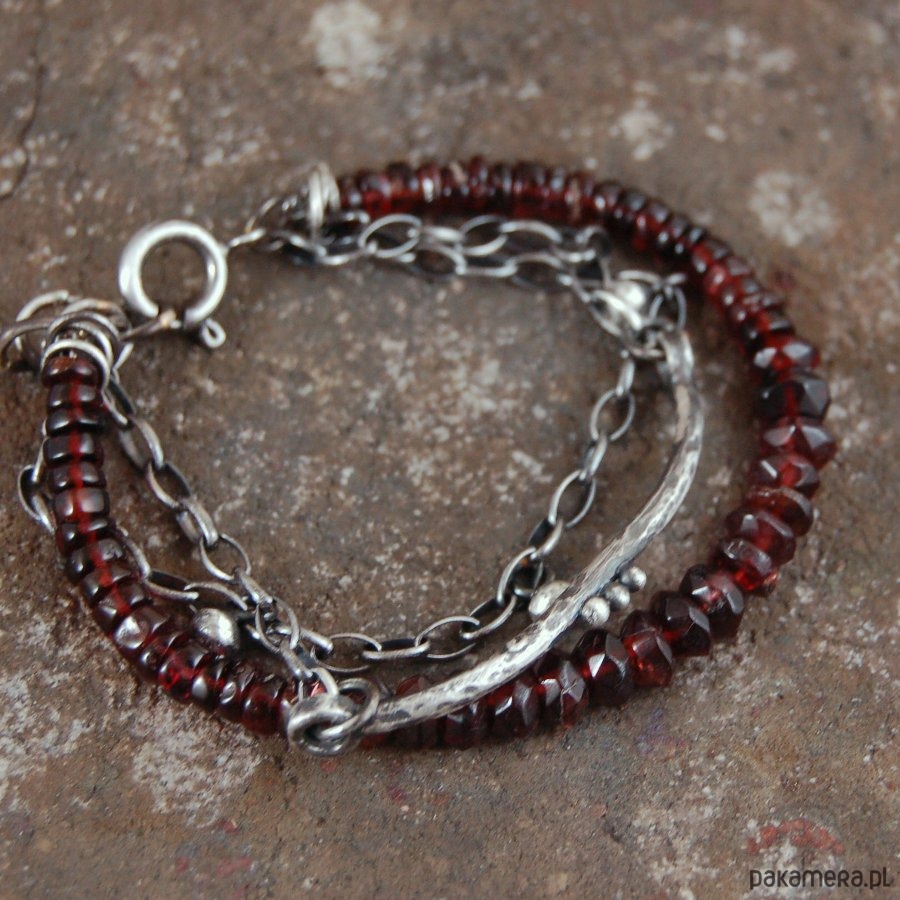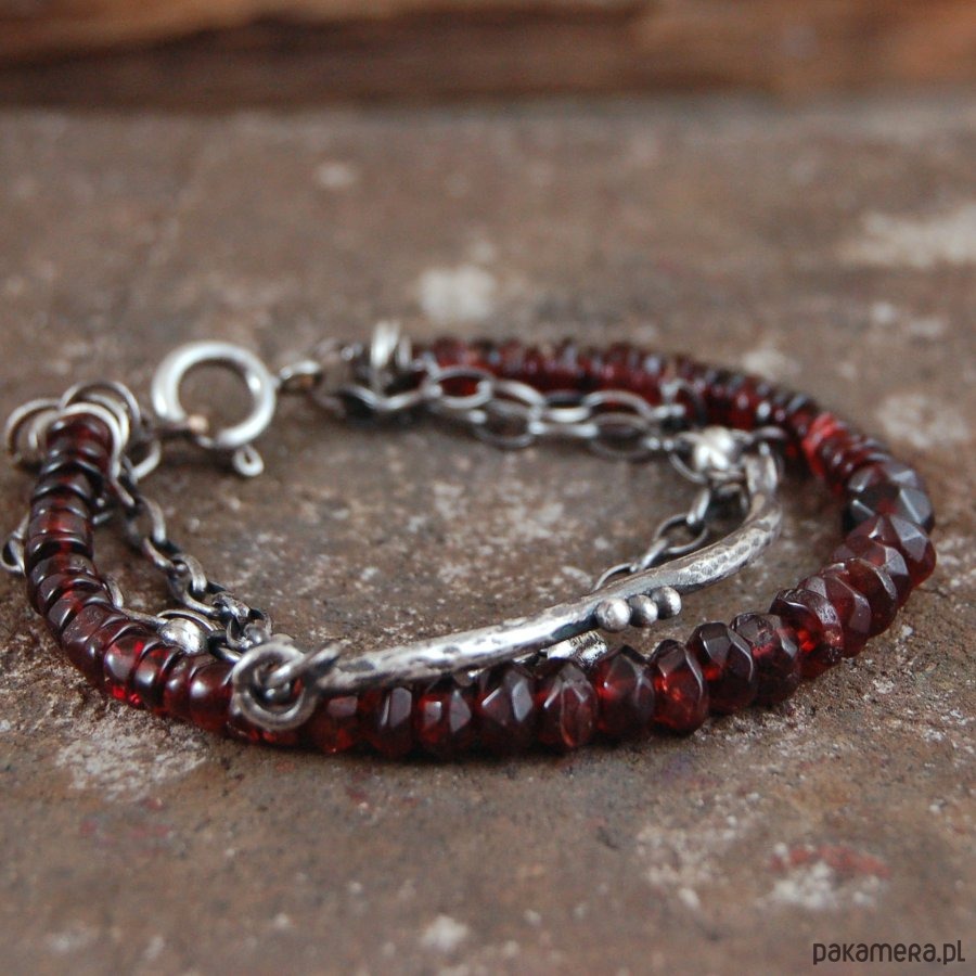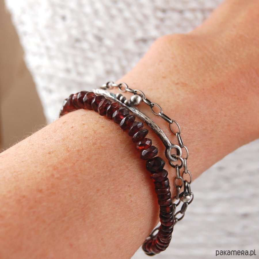 Bransoleta z granatów i oksydowanego srebra. Średnica kamieni 0,4 - 0,7 cm, obwód bransolety 16 - 18 cm.