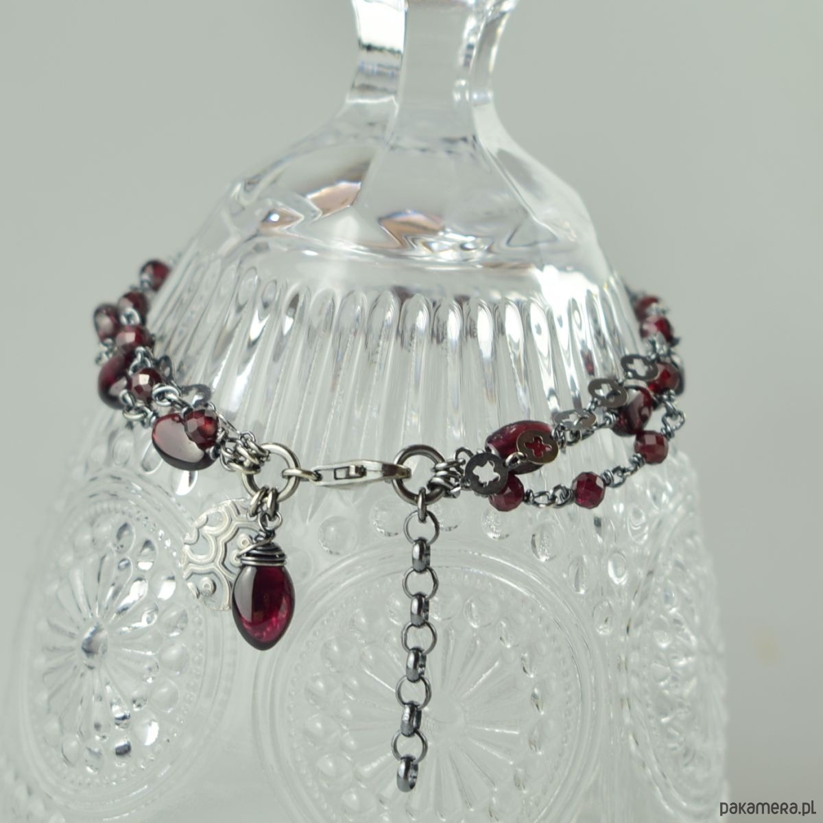 Bransoletka wykonana w całości ze srebra (próba 925) z granatem. Całość została zoksydowana (przyciemniona) i wypolerowana. Długość regulowana 21 - 24 cm. Biżuteria zostanie ozdobnie zapakowana.