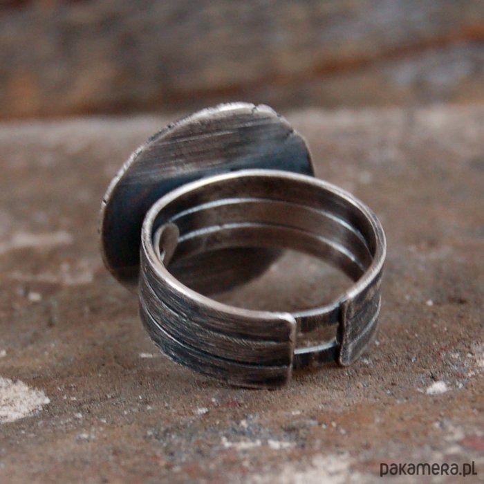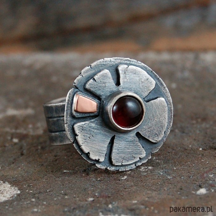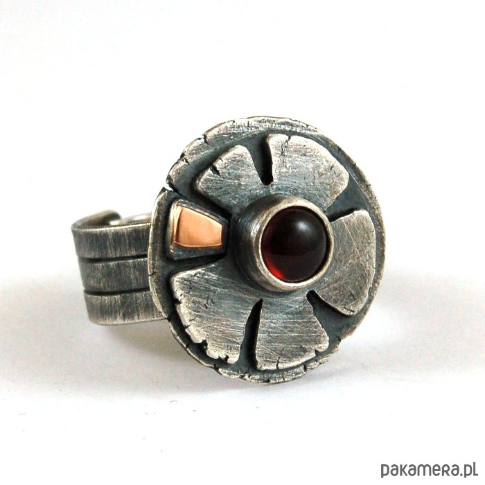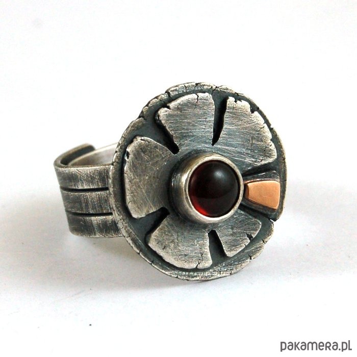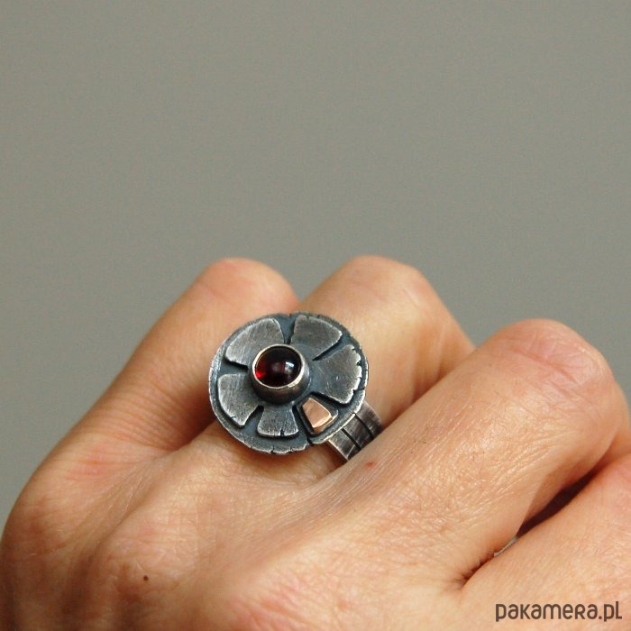 Pierścionek ze srebra, złota próby 585 i granatu. Srebro oksydowane. Wielkość kamienia 0,5 cm, szerokość obrączki ok. 0,8 cm, średnica frontu 1,9 cm, rozmiar regulowany. Przy zamówieniu proszę o podanie rozmiaru, pierścionek zostanie ustawiony.