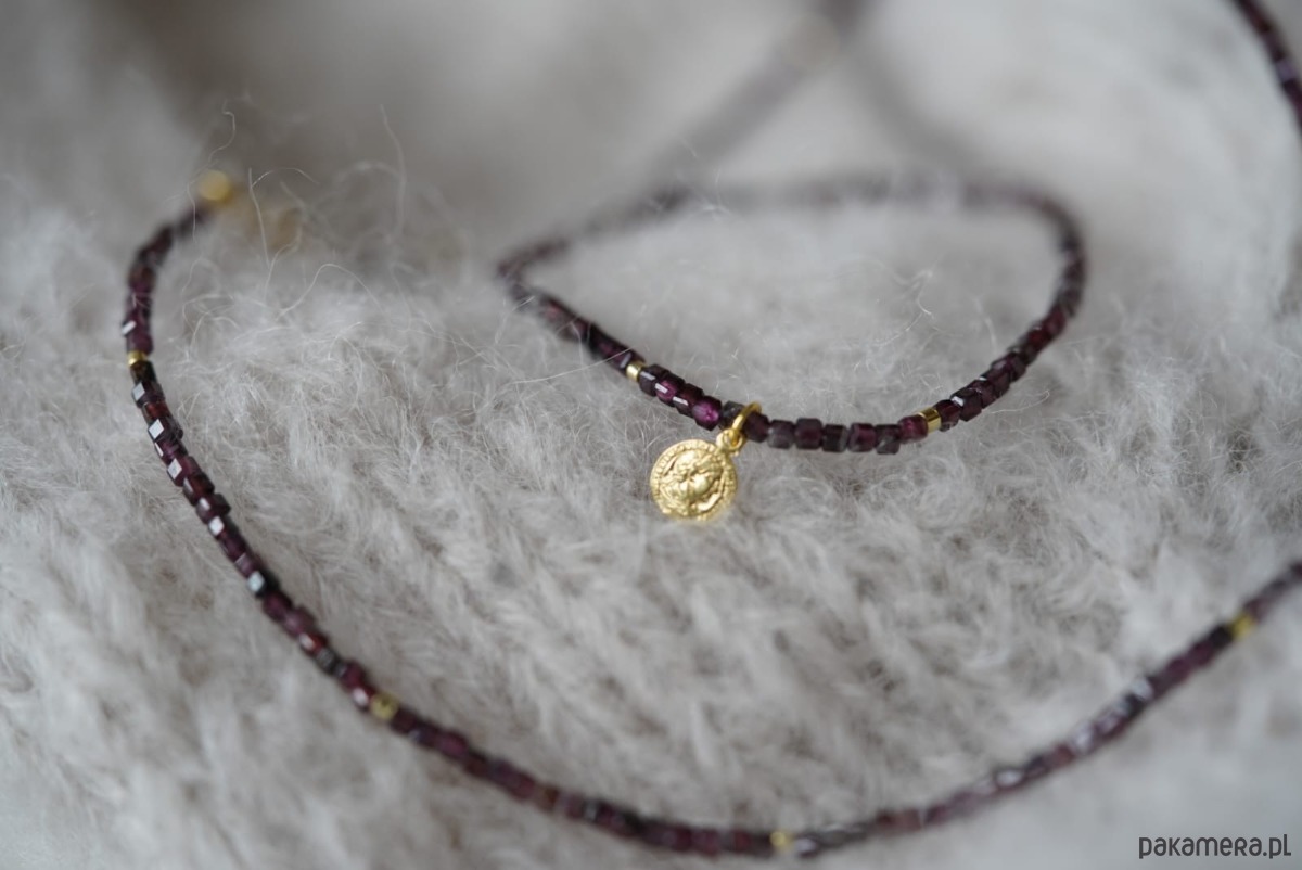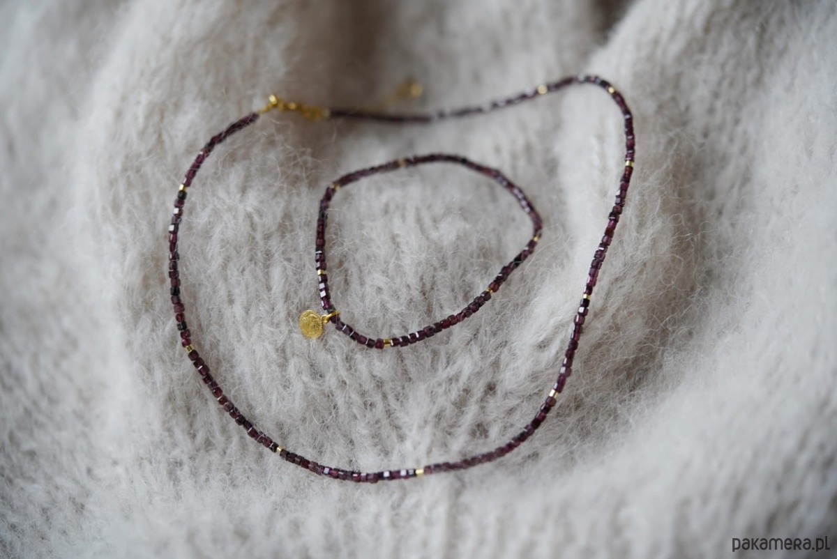 Naszyjnik i elastyczna bransoletka z drobnych kosteczek granatu przeplatanych złoconymi drobinkami srebra próby 925.
