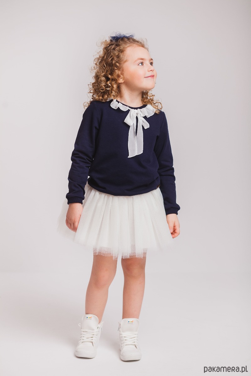 Bluza została wykonana z dzianiny dresowej, wokół dekoltu została naszyta falbanka, która nadaje całości elegancji i oryginalności.